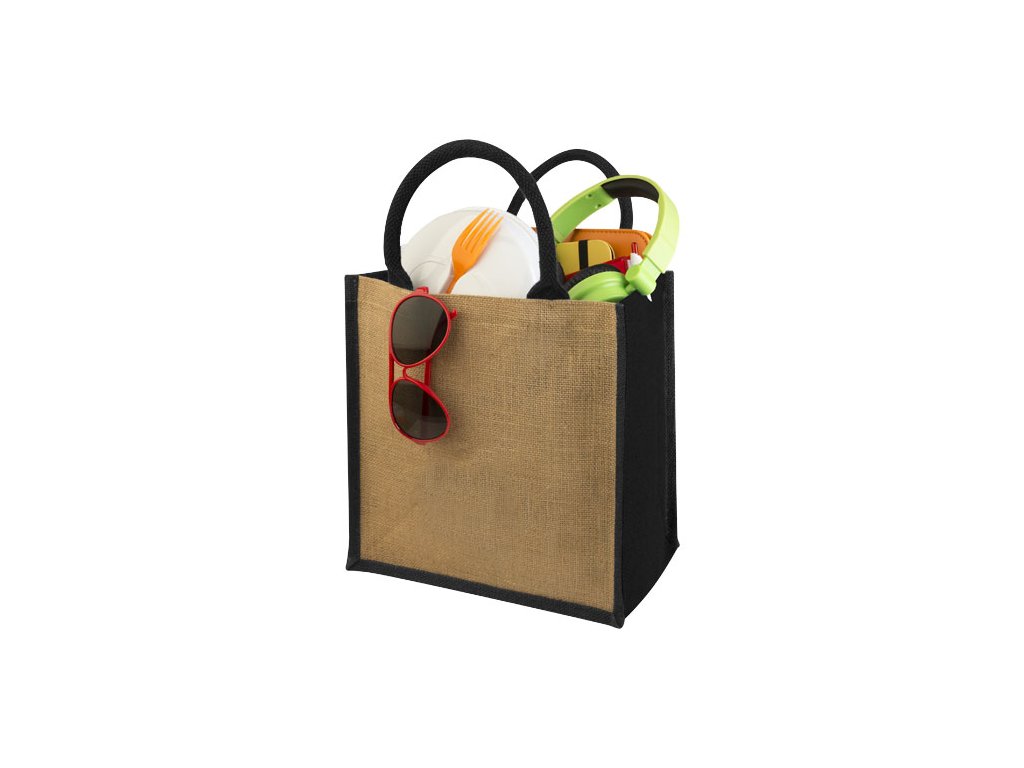 Jutová taška s laminovaným hlavným priestorom a vložkou.  Bavlnené stočené uši, 30 x 30 cm.