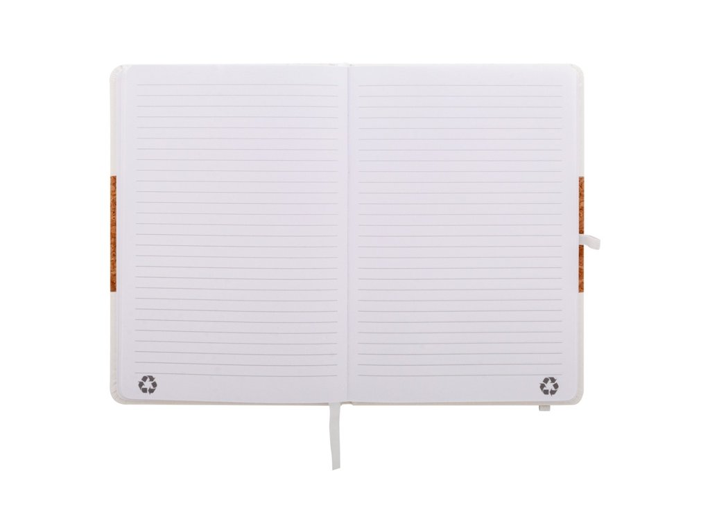 Blok A5 potiahnutý prírodným korkom a recyklovanou PU kožou so záložkou v zodpovedajúcej farbe, gumičkou a držiakom na pero. S 80 linajkovými listami z recyklovaného papiera.
