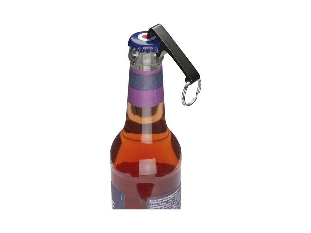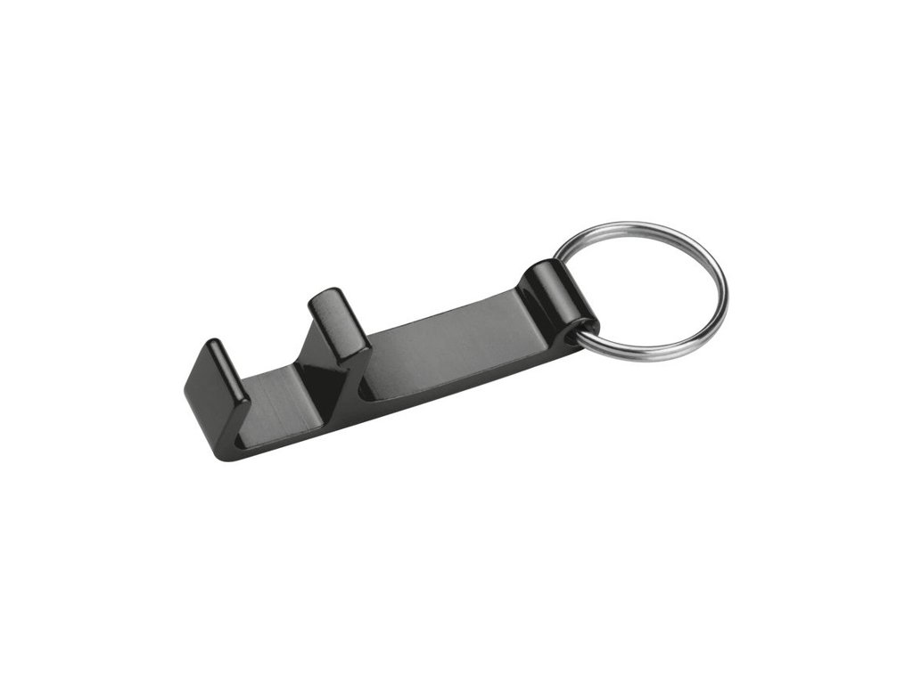 Kovová kľúčenka s otváračom fliaš a veľkým priestorom pre potlač. Obrátene je možné kľúčenku použiť ako držiak na mobil.