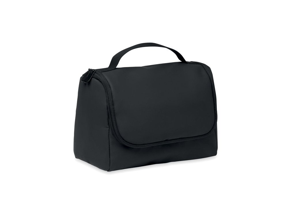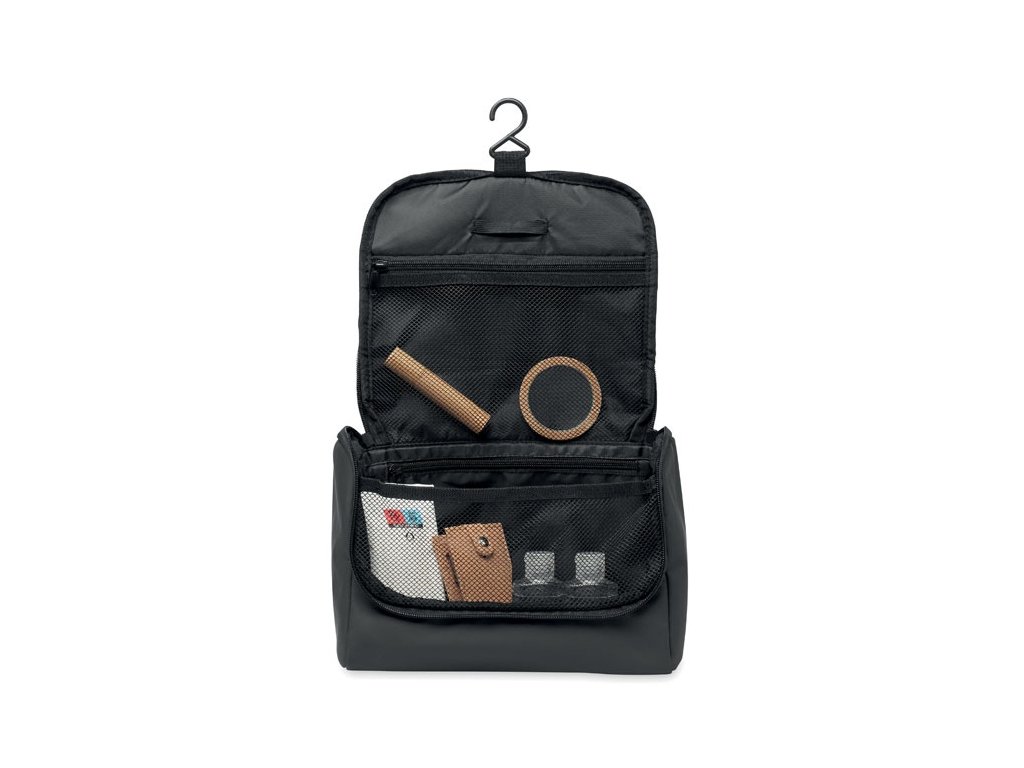 Kozmetická taštička z mäkkého PU so závesným háčikom a podšívkou z 210D RPET. Jedna veľká hlavná priehradka s vnútorným sieťovaným vreckom na zips a 1 sieťovaným vreckom.