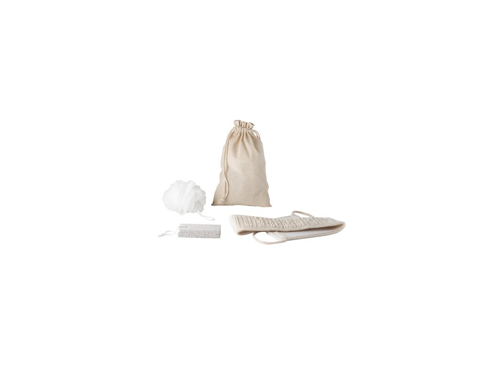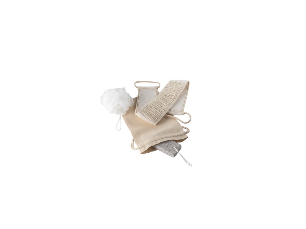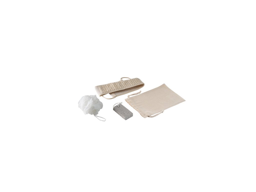 Súprava do kúpeľa obsahuje: rPET + PET obláčik do kúpeľa s polyesterovou rúčkou, pommes kameň s polyesterovou šnúrkou a exfoliačný bavlnený a jutový uterák na chrbát, s bavlnenými rúčkami