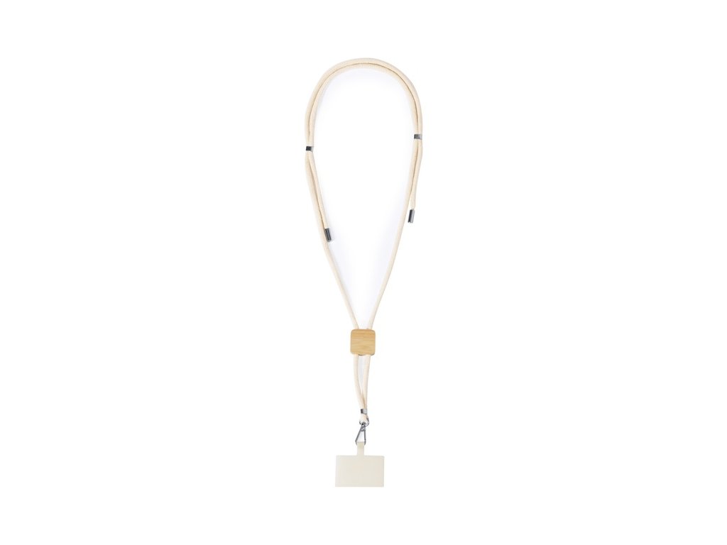 Nastaviteľná dĺžka, Bavlnené pútko s nastaviteľnou dĺžkou, s držiakom na mobil s bambusovým štítkom, vložkou na telefón a kovovou karabínou.
