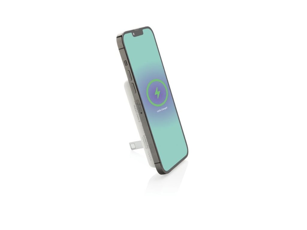 Vrecková powerbanka 5 000 mAh a 5W magnetickou bezdrôtovou nabíjačkou. Powerbanka obsahuje lítium-polymérovú batériu triedy A s výdržou 5 000 mAh. Integrovaný stojan na telefón. Vstup typu C 5V/2,4A; výstup typu C: 5V/2A.4A. PVC free. Vrátane kábla.