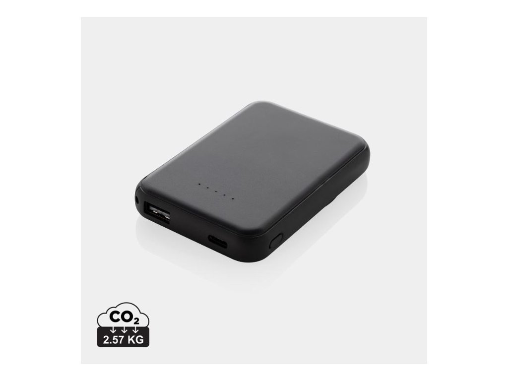 Vrecková powerbanka 5 000 mAh a 5W magnetickou bezdrôtovou nabíjačkou. S možnosťou výstupu USB A a UCB C. Obsahuje lítium-polymérovú batériu triedy A s výdržou 5 000 mAh. Vstup typu C 5V/2,4A; výstup USB C/USB A: 5V/2A.4A. PVC free. Vrátane kábla.