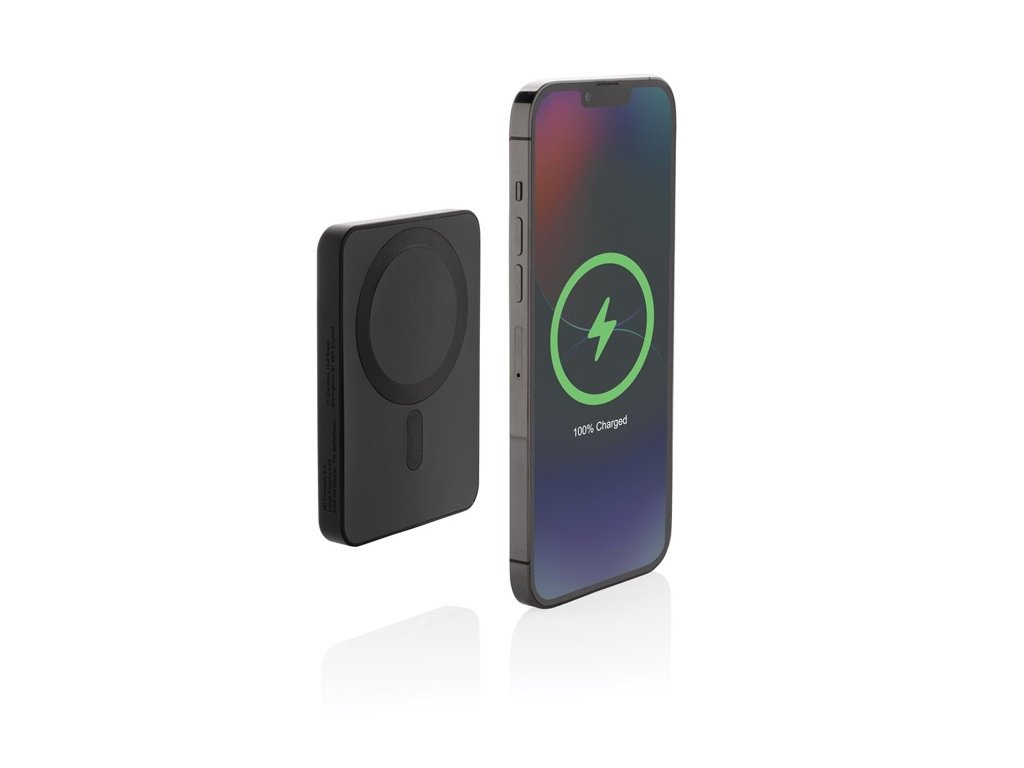 Vrecková powerbanka 5 000 mAh s magnetickým bezdrôtovým nabíjaním 5W. Podiel recyklátu: 20%. Svetelné indikátory stupňa nabitia. USB vstup C: 5V/2,4A. USB C výstup: 5V/2,4A, bezdrôtový výstup: 5W. Vrátane kábla z rec. TPE. PVC free. FSC® krabička.