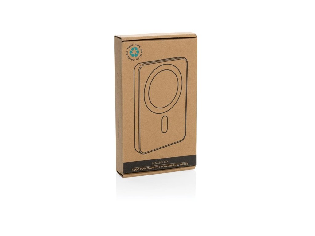 Vrecková powerbanka 5 000 mAh s magnetickým bezdrôtovým nabíjaním 5W. Podiel recyklátu: 20%. Svetelné indikátory stupňa nabitia. USB vstup C: 5V/2,4A. USB C výstup: 5V/2,4A, bezdrôtový výstup: 5W. Vrátane kábla z rec. TPE. PVC free. FSC® krabička.