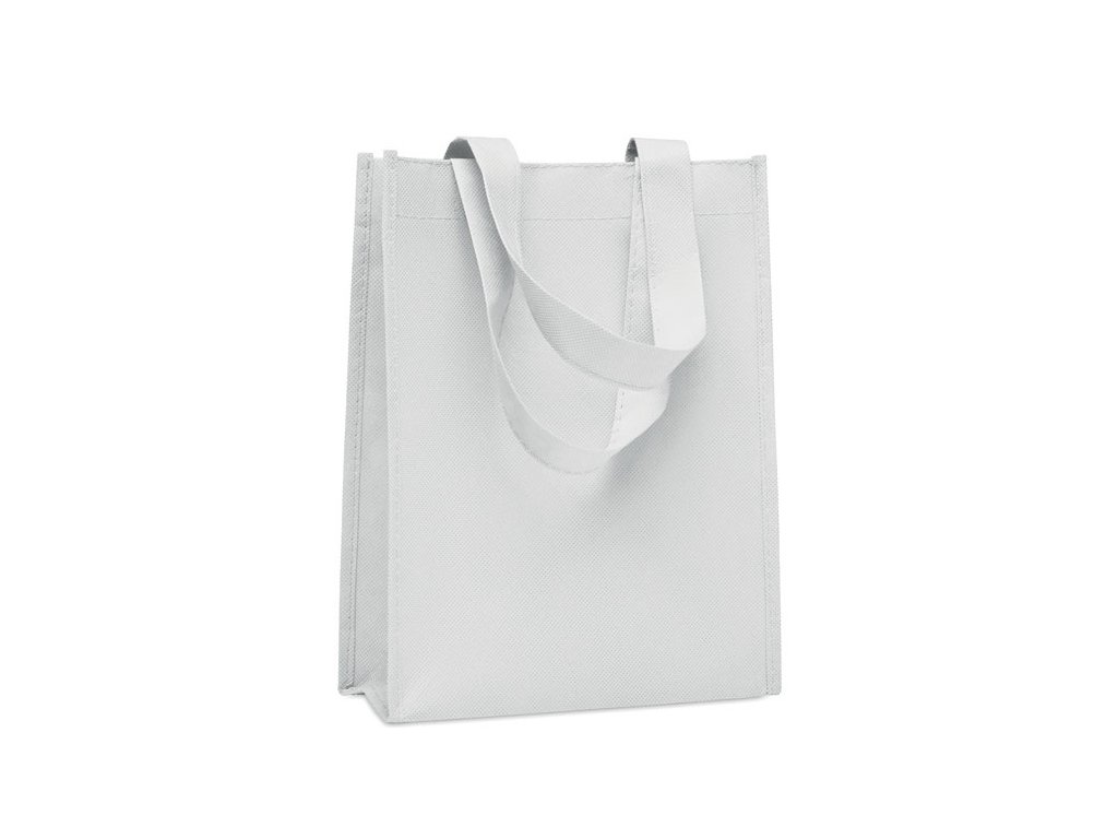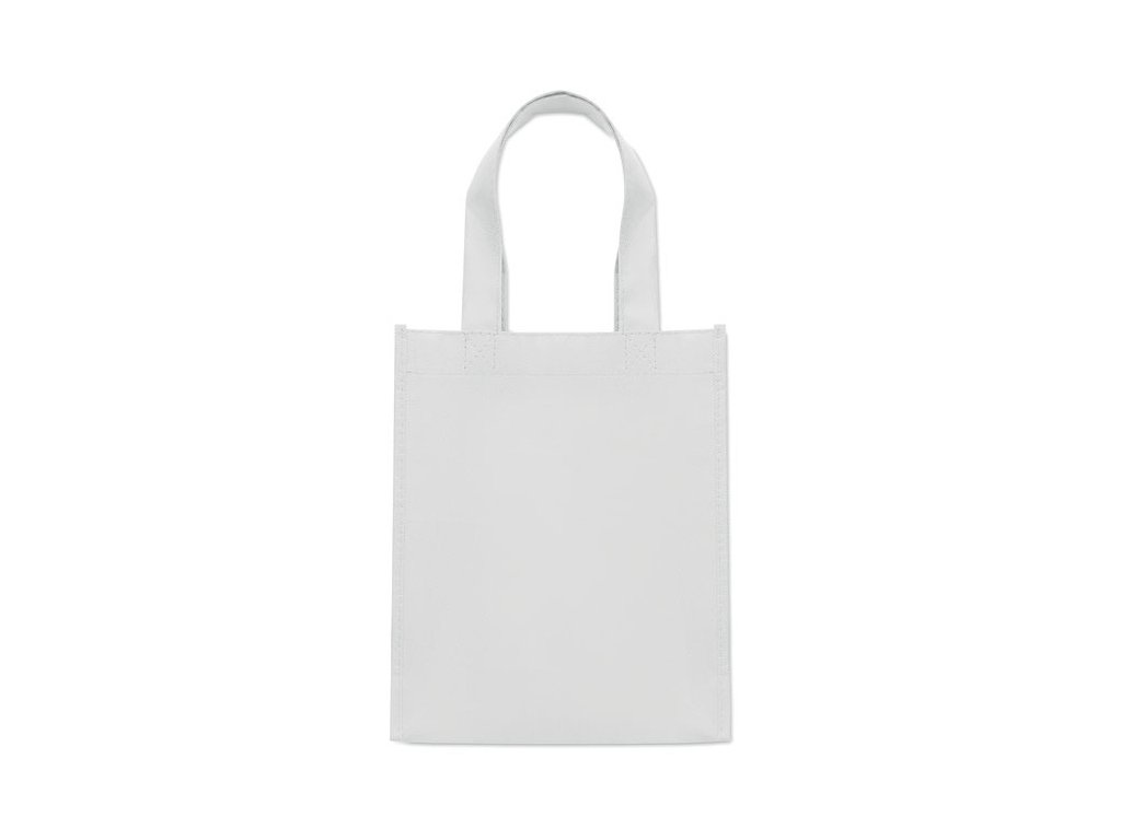 Malá darčeková taška z netkanej RPET tkaniny s krátkymi rúčkami a výstuhami.