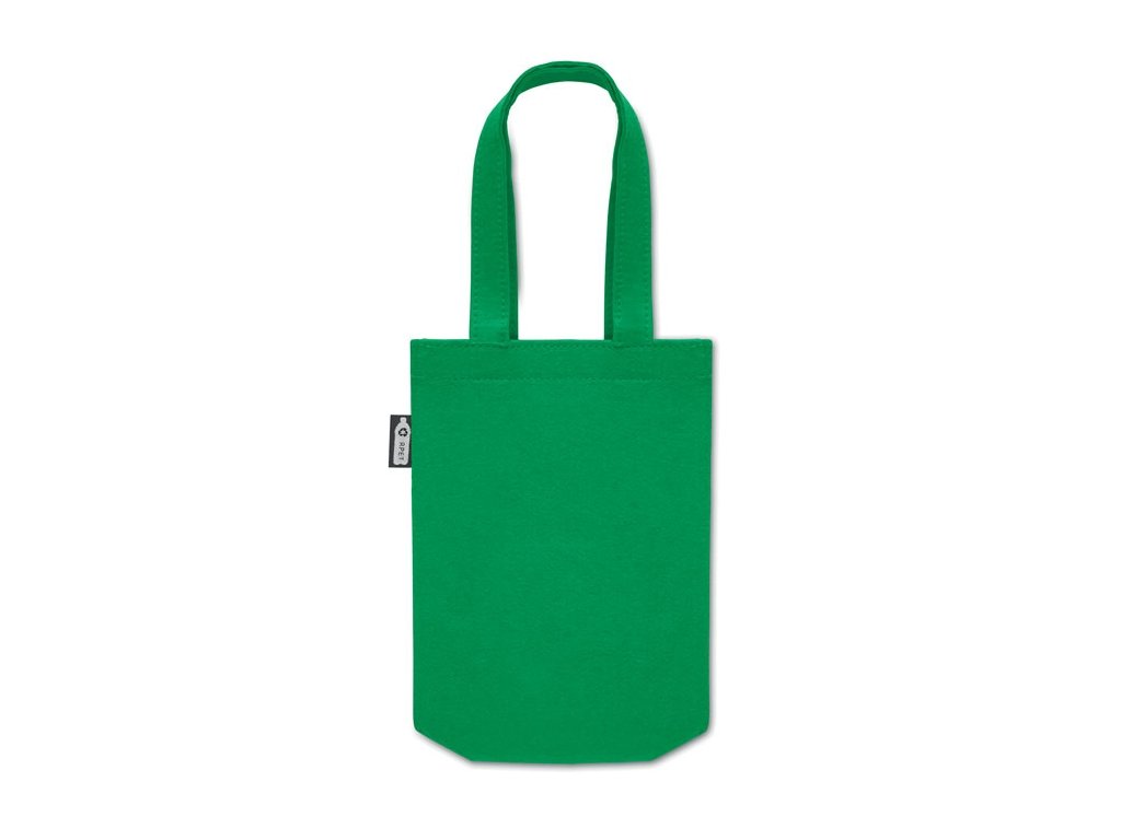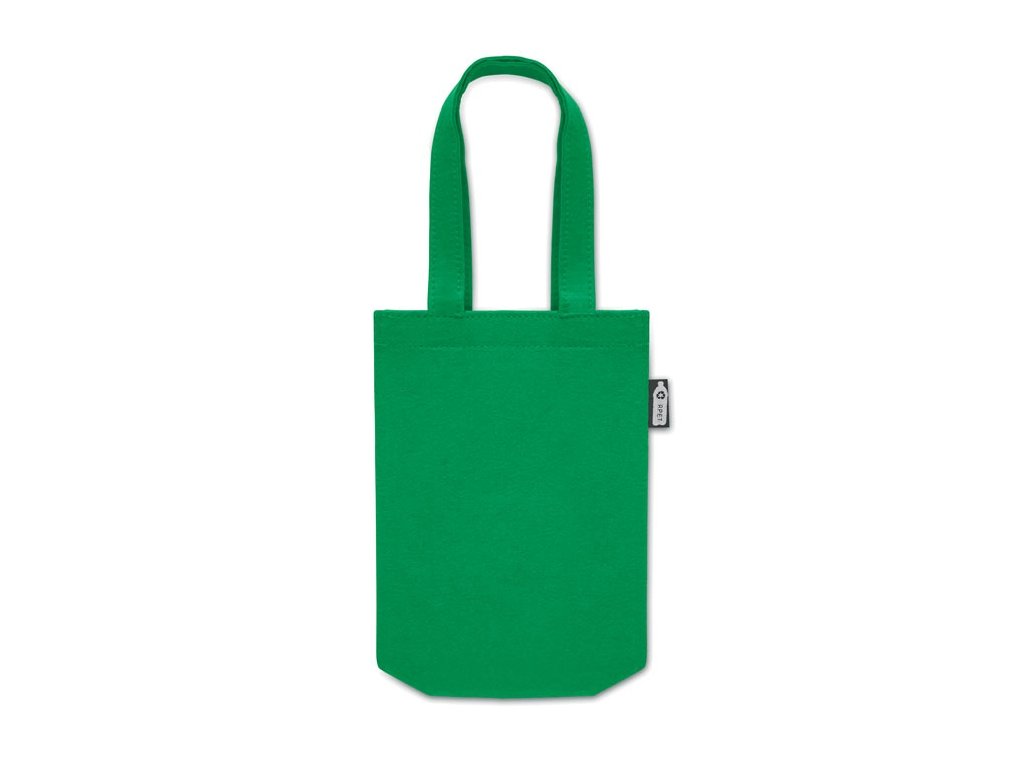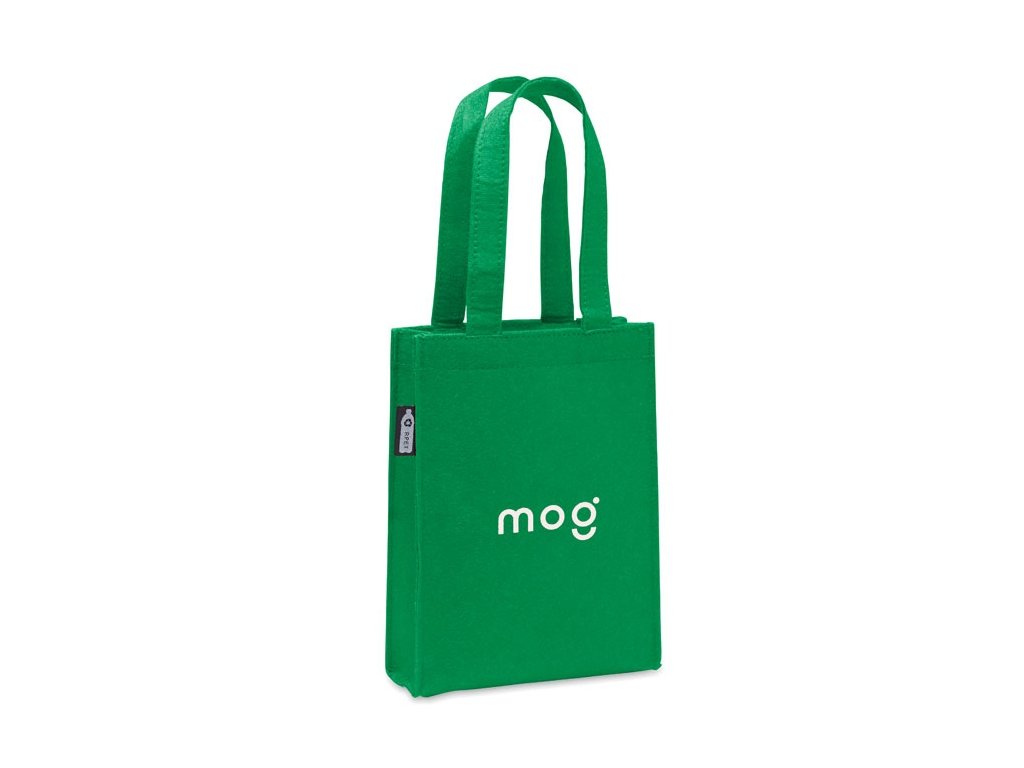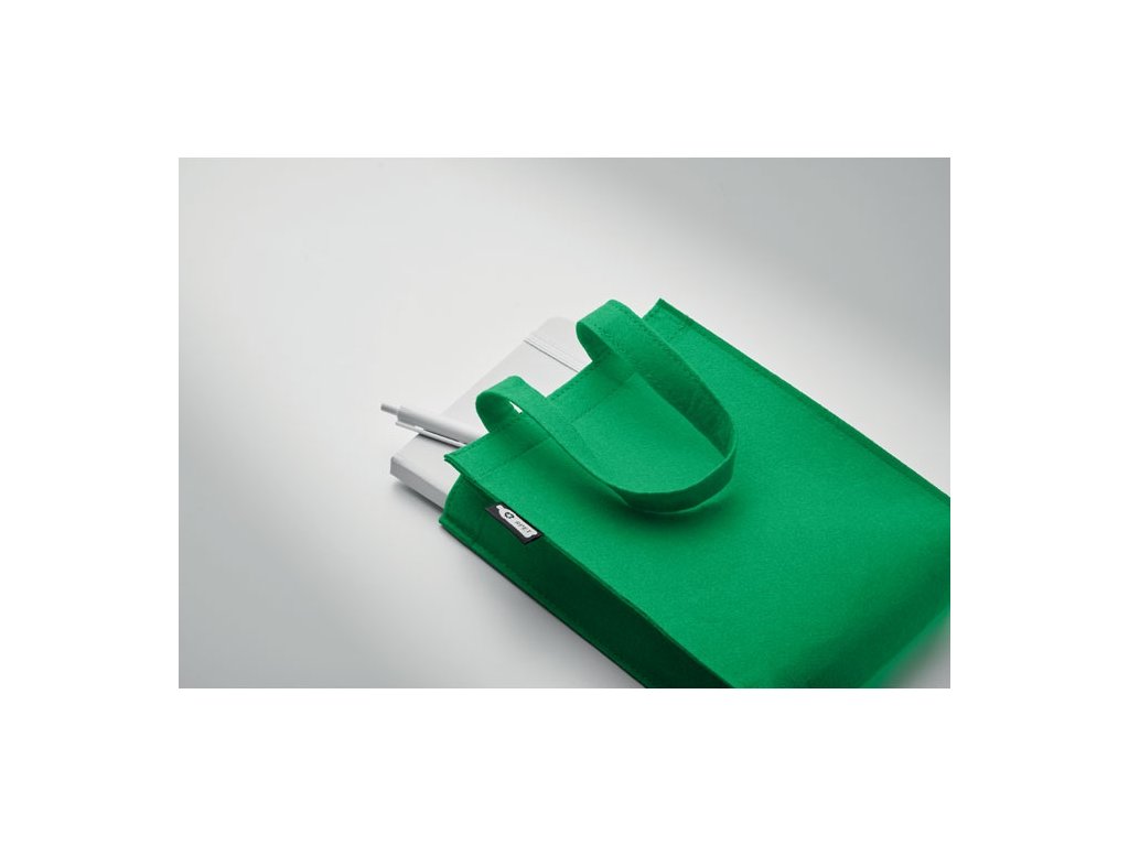 Malá RPET plstená darčeková taška s krátkymi rúčkami a spodným klinom. Hrúbka plsti: 1 mm.