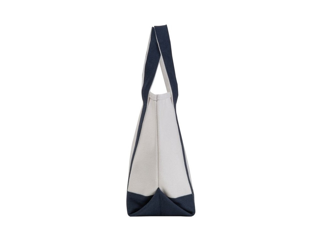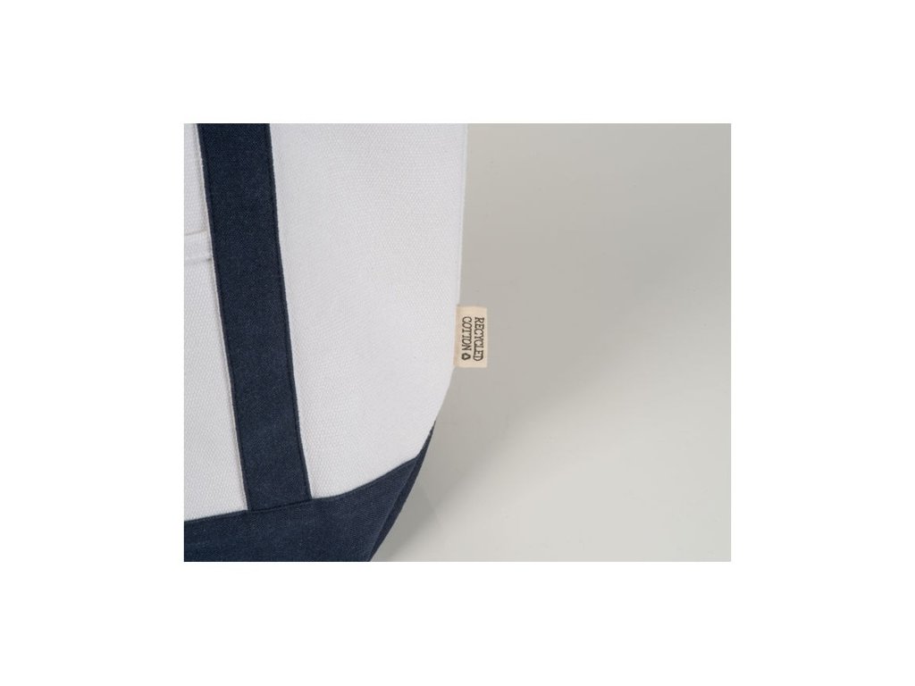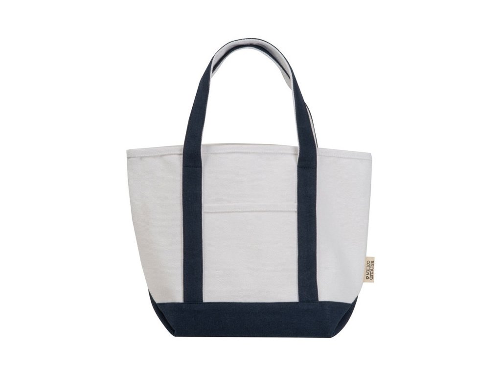 Malá taška (730 g/m2) z recyklovanej bavlny s dvoma farebnými dlhými popruhmi a stabilným dnom. Univerzálne použitie na nákupy, pláž a pod.