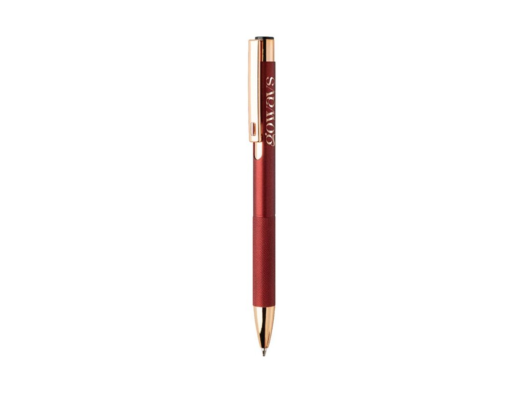 Guľôčkové pero z recyklovaného hliníka s matným telom, textúrovaným úchopom a detailmi ružového zlata. So špeciálnym povrchom na zrkadlové laserové gravírovanie vo farbe ružového zlata. S modrou náplňou.