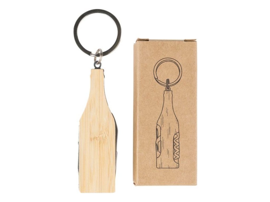 Multifunkčná kľúčenka z bambusu a nehrdzavejúcej ocele v tvare fľaše s kovovým krúžkom. Súčasťou balenia je vývrtka, pilník na nechty, otvárač na fľaše a čepeľ. Jednotlivo balené v hnedej papierovej krabičke.