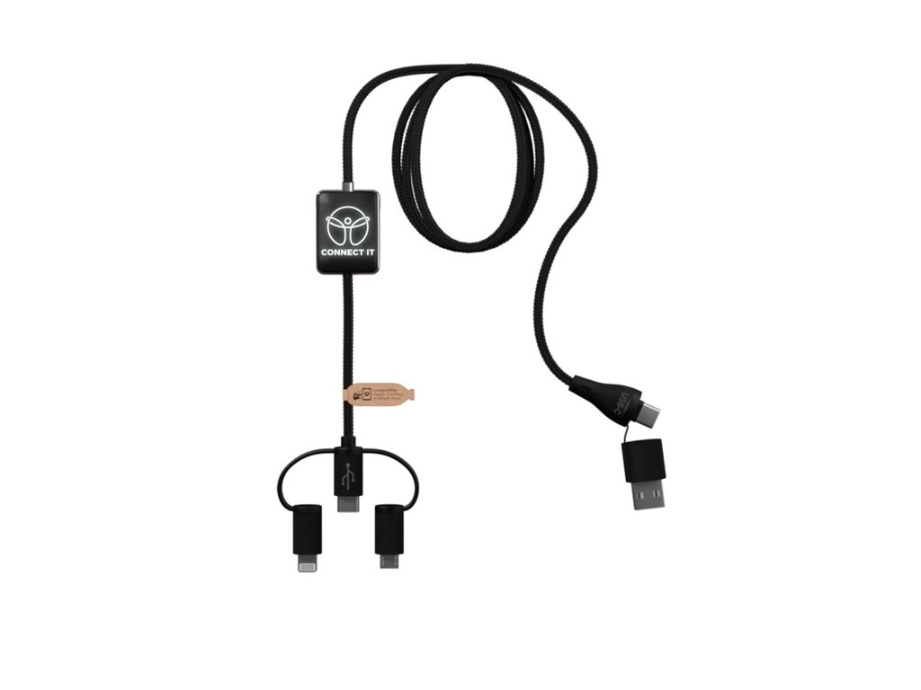Nabíjací kábel 5v1 s gumovým a kovovým povrchom a dvojitým podsvieteným logom. Kompatibilný s Apple CarPlay a Android Auto. Vďaka duálnemu USB-A USB-C výstupu je kompatibilný s najnovšími počítačmi (USB-C). V biologicky rozložiteľnom TPU sáčku. Dĺžka: 1 m
