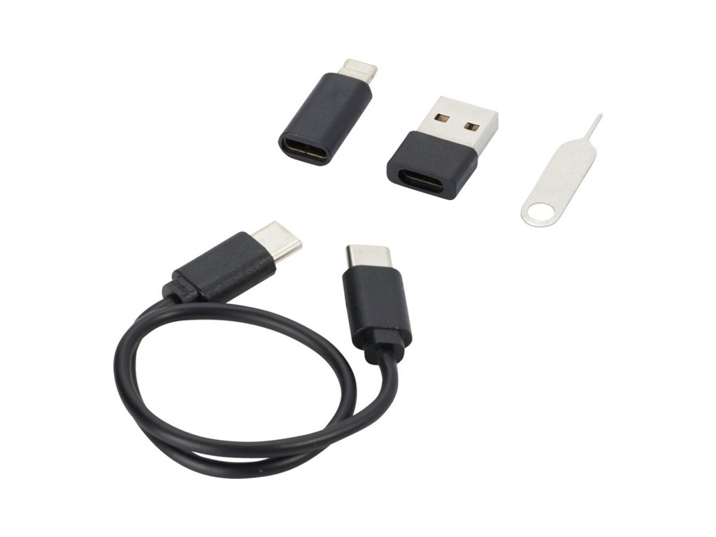 Modulárny kábel na prenos dát a nabíjanie z recyklovaného plastu v boxe, ktorý slúži ako stojan. Vstup Typ-C a USB-A a výstup Typ-C/iOS/mikro USB. Box má priestor na karty micro SD a nano SIM karty. Dĺžka: 26 cm. Dodávané v obálke