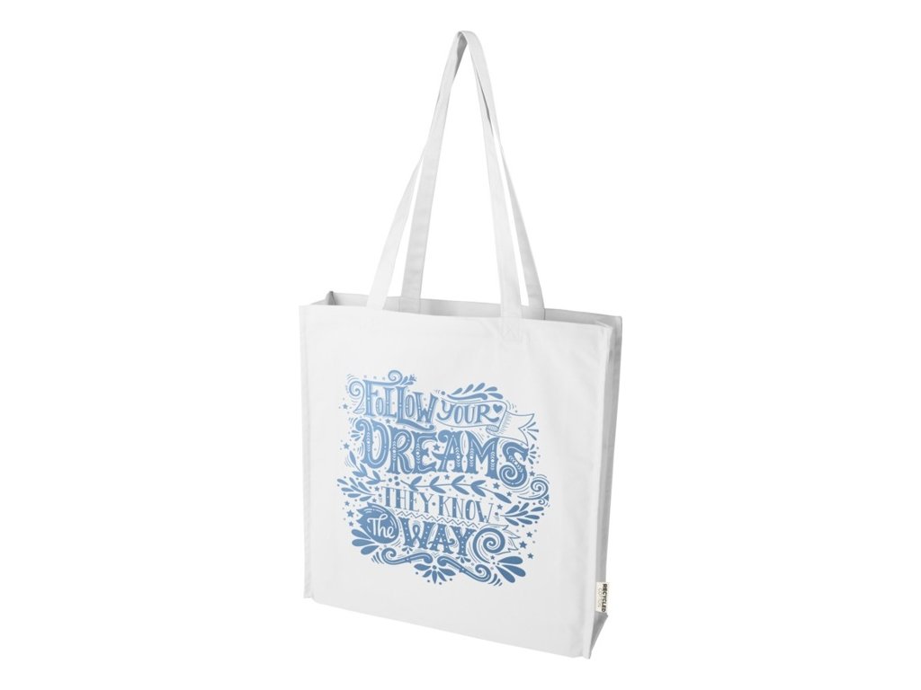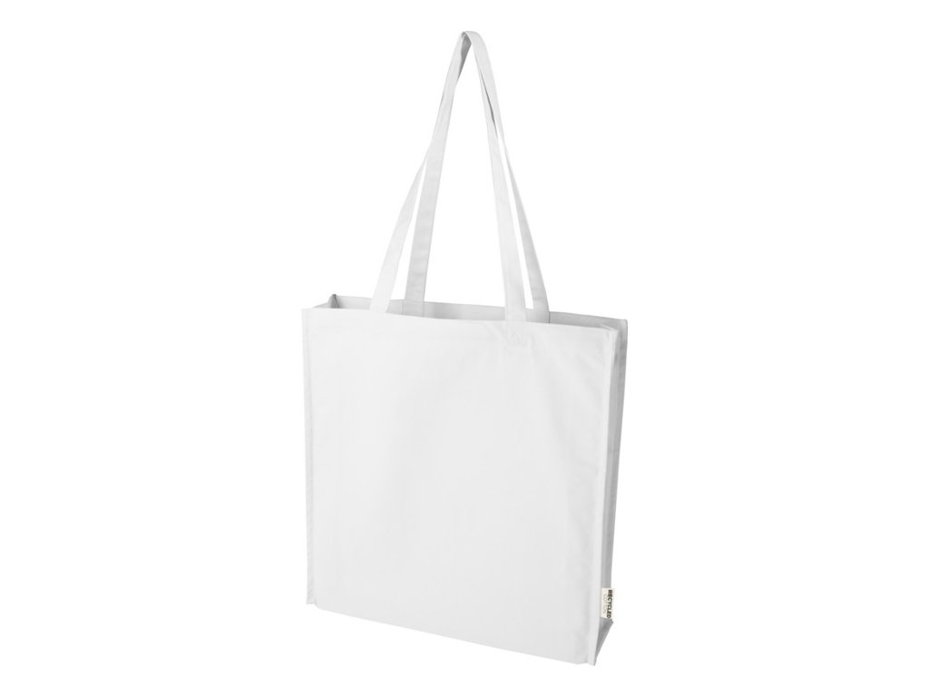 Nákupná taška s klinom Florida zo 100% recyklovanej bavlny s certifikáciou GRS s gramážou 270 g/m2. S kapacitou až 14 litrov a 30 cm dlhými ušami je ideálny pre ľahké prenášanie potravín, kníh alebo každodenných nevyhnutností.