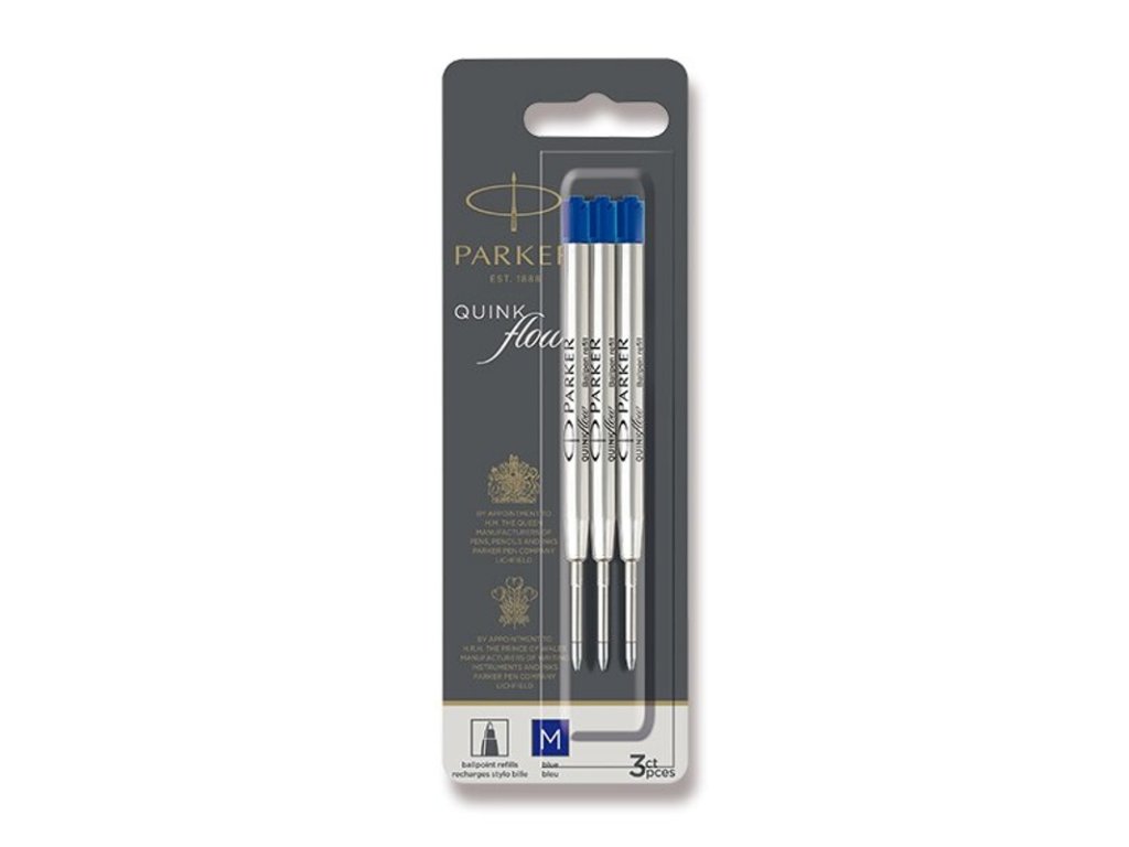 Náhradná náplň do guľôčkových pier Parker. Šírka M (1 mm). Náplň je chránená vrchnákom vo farbe náplne. Balenie obsahuje 3 kusy náplní.