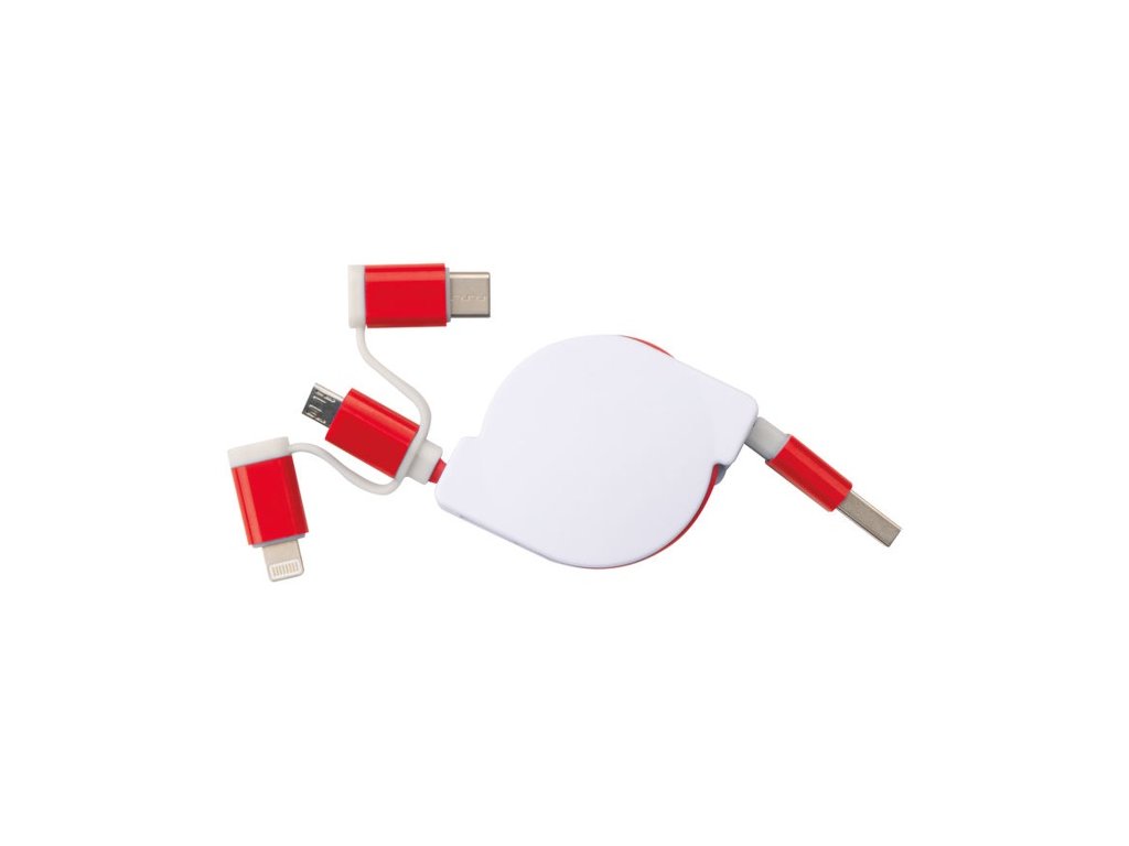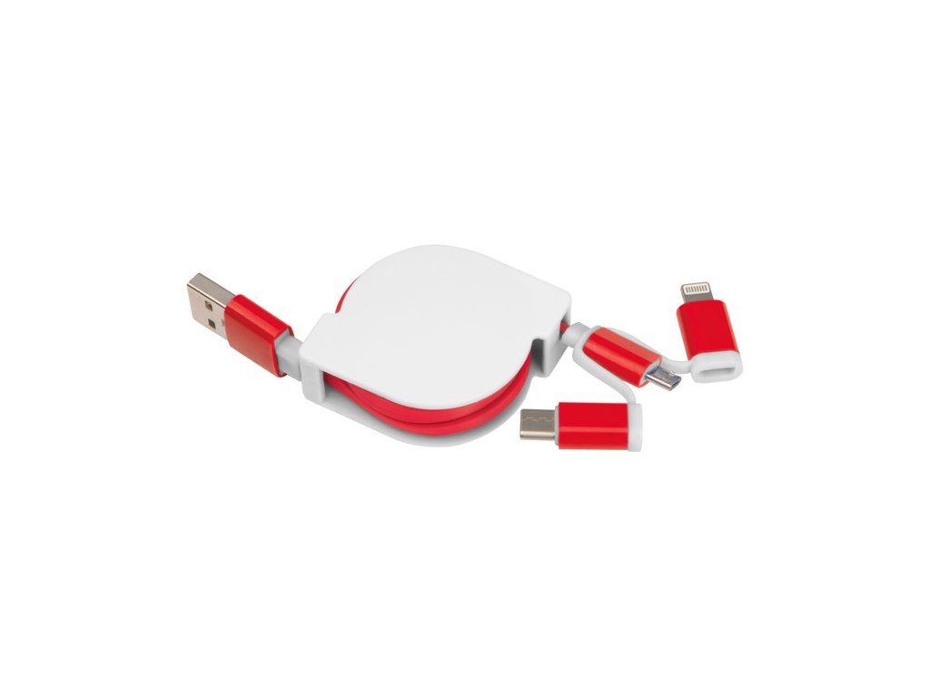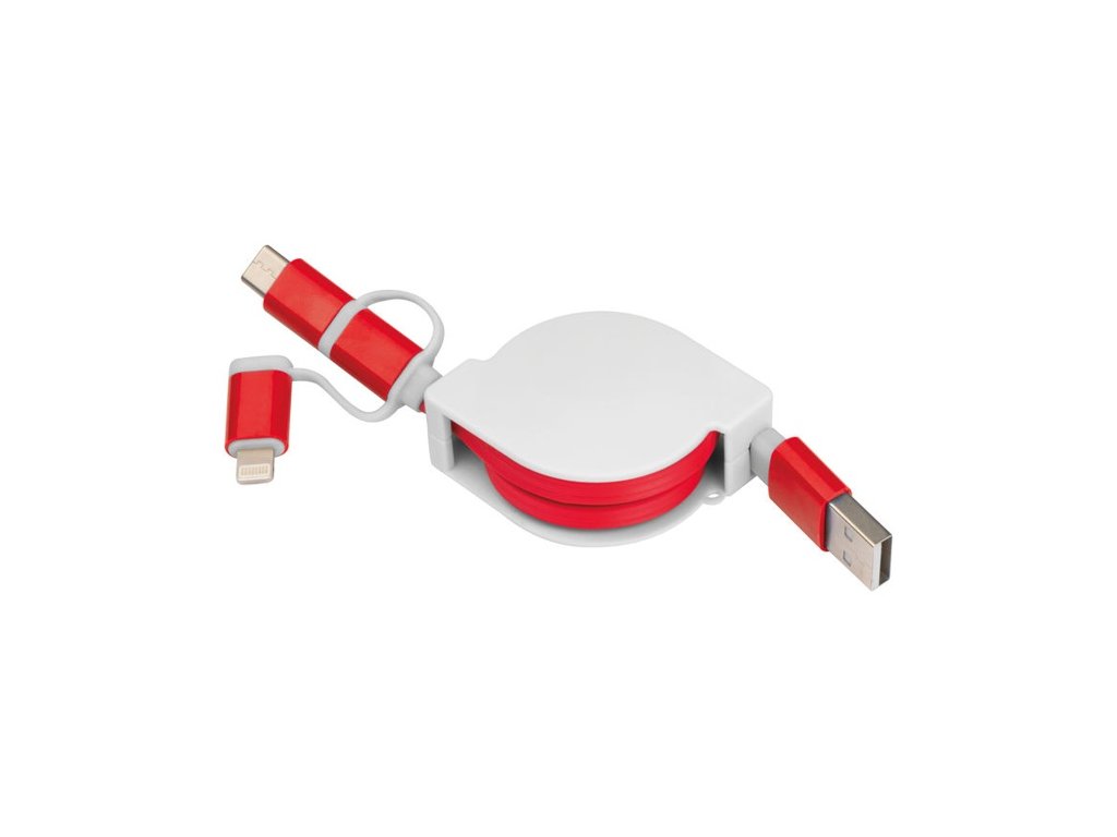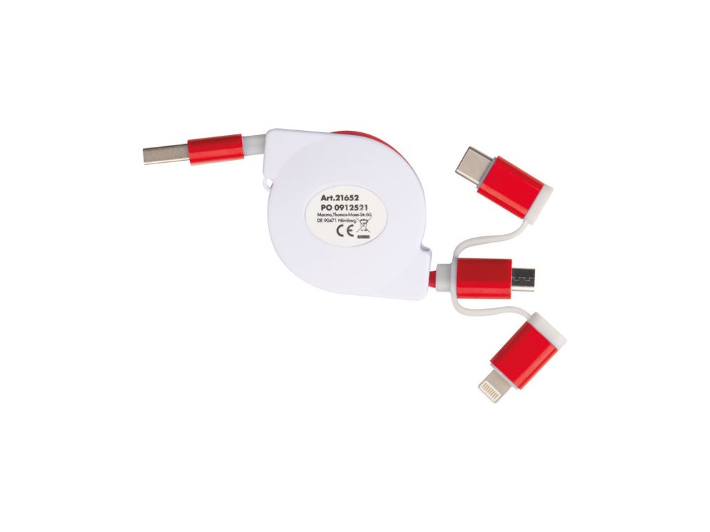Vyťahovací nabíjací kábel v plastovom kryte s USB zástrčkou a pripojením iOS Lightning, C-Type a Micro USB. Nabíjací výkon max. 5V/2A. Dĺžka kábla cca. 80 cm.