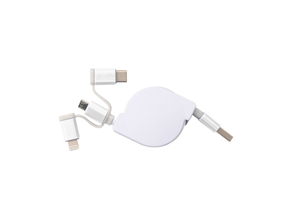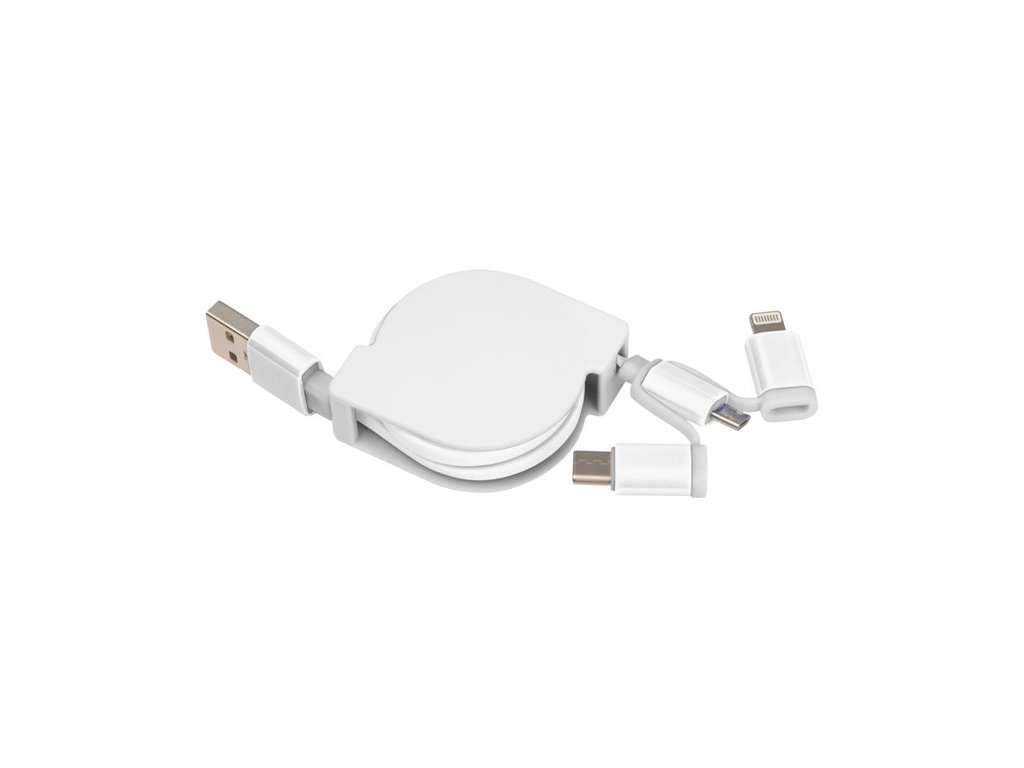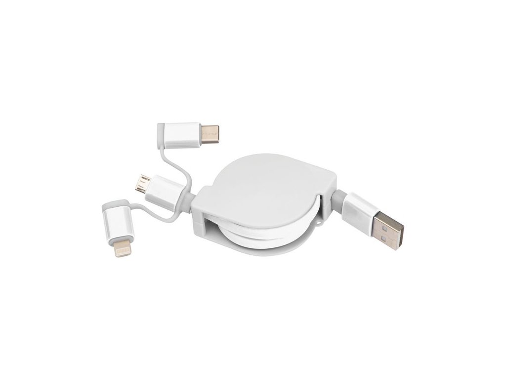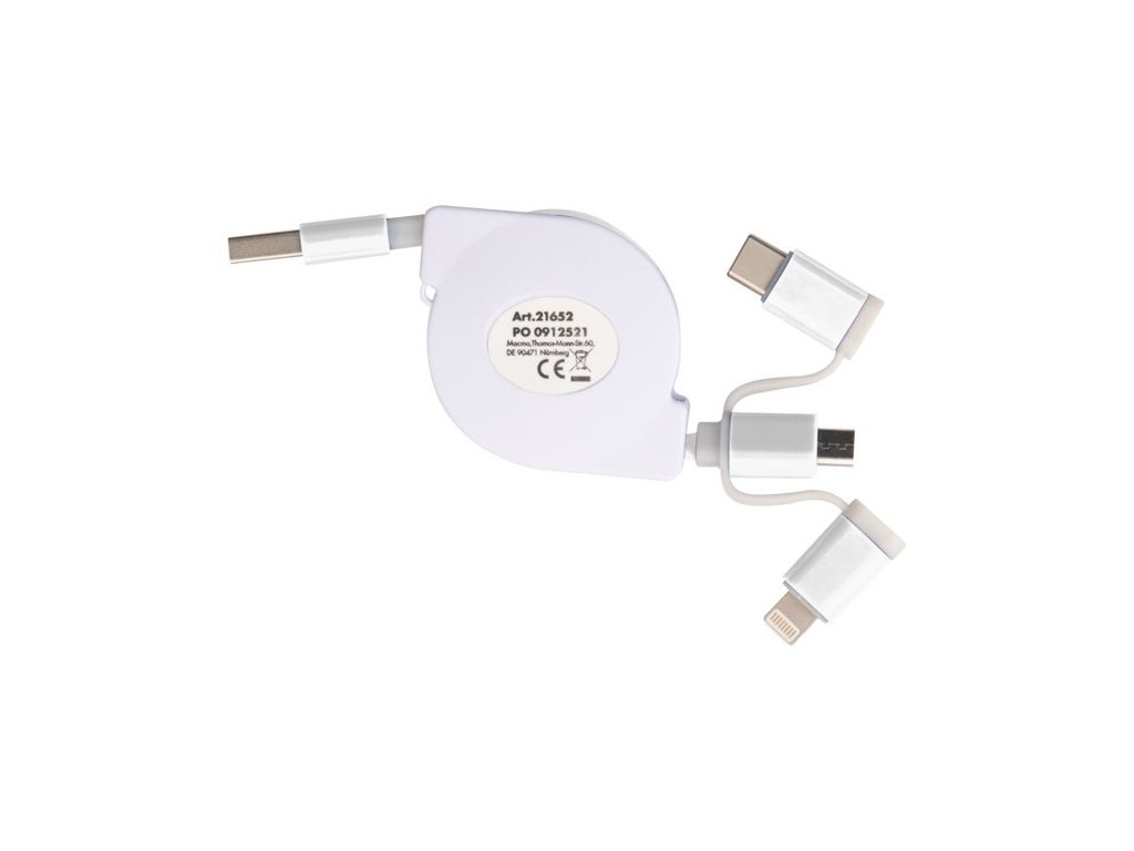 Vyťahovací nabíjací kábel v plastovom kryte s USB zástrčkou a pripojením iOS Lightning, C-Type a Micro USB. Nabíjací výkon max. 5V/2A. Dĺžka kábla cca. 80 cm.