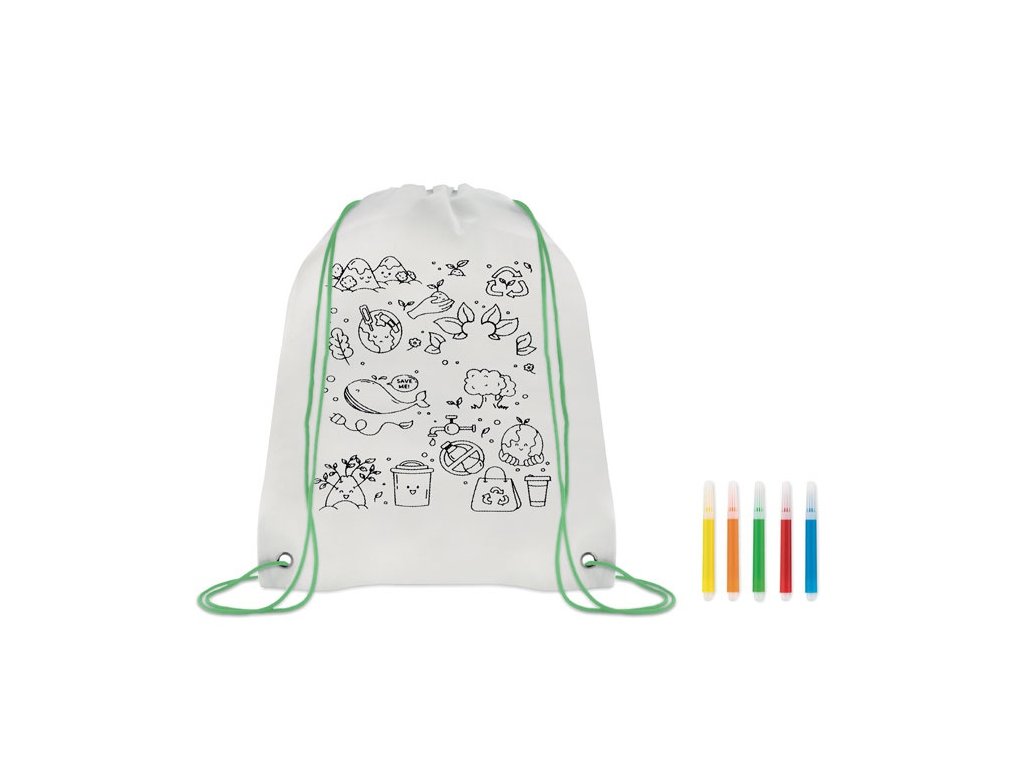 Netkaná taška so sťahovacou šnúrkou s 5 fixkami a dizajnom na vyfarbenie.