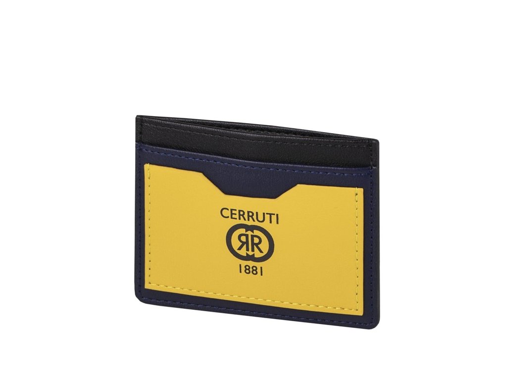 Farebný nádych v našich kolekciách CERRUTI 1881: trojfarebná peňaženka Brick Card je vyrobená z vegánskej kože a podpísaná nadrozmerným, no jemným tlačeným podpisom.