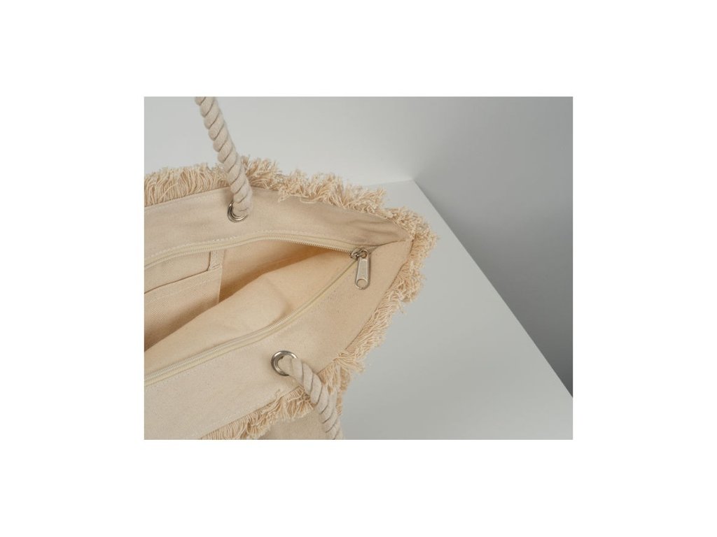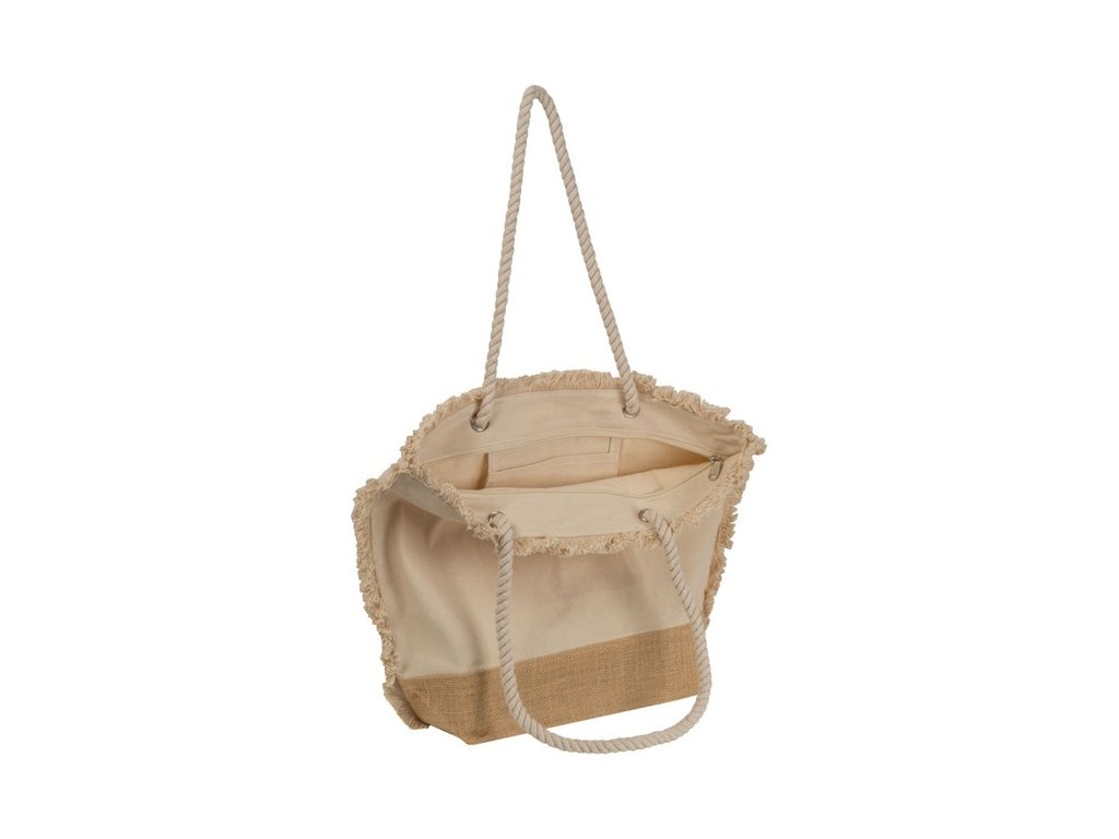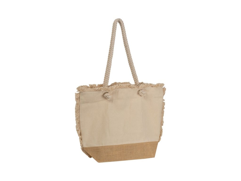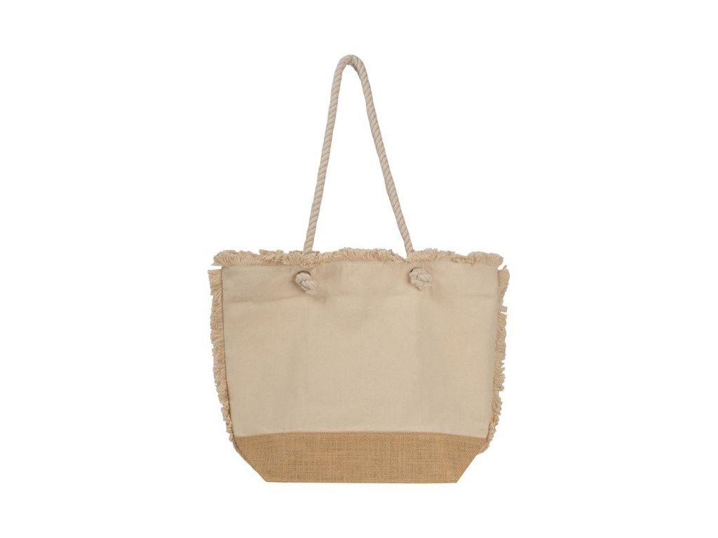 Oeko-Tex® plážová taška 320g/m2 zo štruktúrovaného bavlneného materiálu prírodnej farby s jutovým dnom a šnúrovanými ušami. Ideálna na pláž.