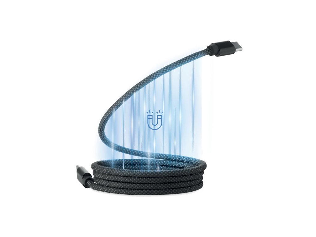 Pletený magnetický kábel odolný voči zamotaniu vyrobený z hliníka a RPET s certifikátom GRS. Typ C do C, rýchle nabíjanie 60 W, dĺžka 1 m. Vždy sa úhľadne stohuje a nikdy sa nezaviaže do uzla.