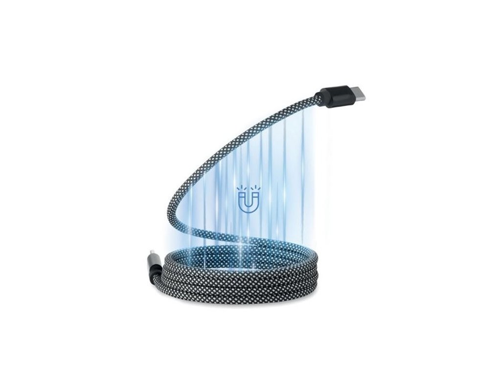 Pletený magnetický kábel odolný voči zamotaniu vyrobený z hliníka a RPET s certifikátom GRS. Typ C do C, rýchle nabíjanie 60 W, dĺžka 1 m. Vždy sa úhľadne stohuje a nikdy sa nezaviaže do uzla.