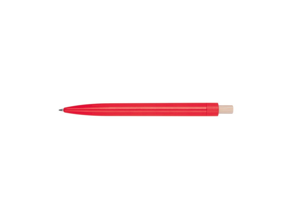 Guľôčkové pero vyrobené z recyklovaného ABS s tlačidlom z bambusu. Obsahuje modrú plastovú náplň.