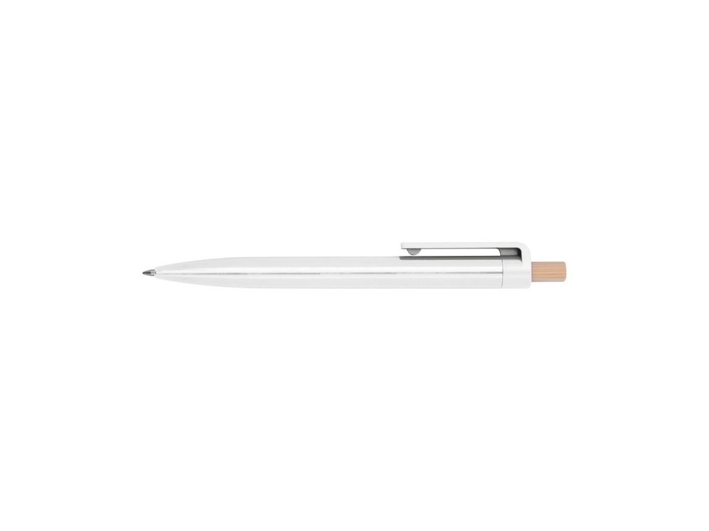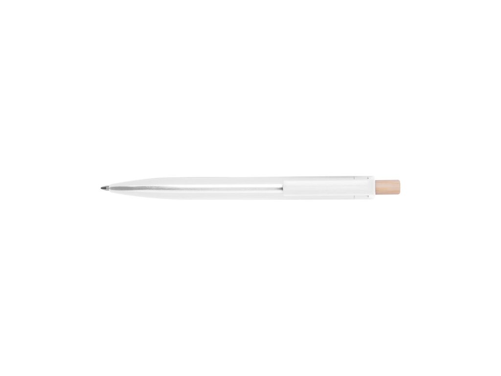 Guľôčkové pero vyrobené z recyklovaného ABS s tlačidlom z bambusu. Obsahuje modrú plastovú náplň.