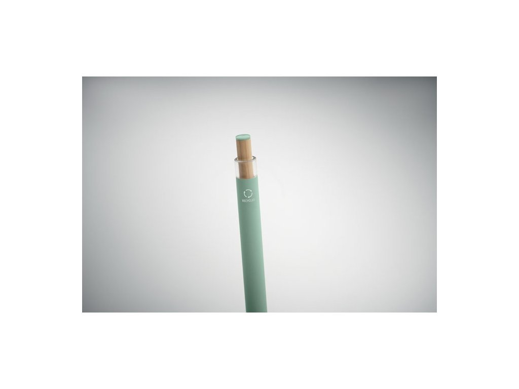 Guľôčkové pero z recyklovaného hliníka s bambusovým tlačidlom, farebne zladeným detailom a kovovým klipom v rovnakom prevedení. Modrý atrament.
