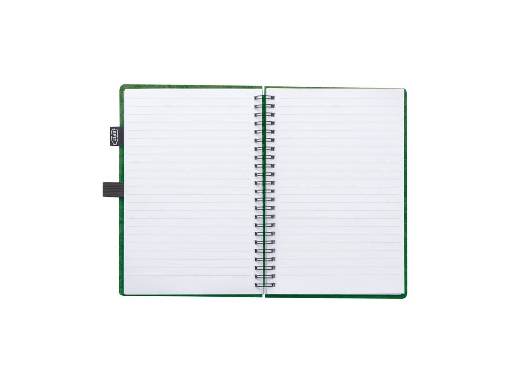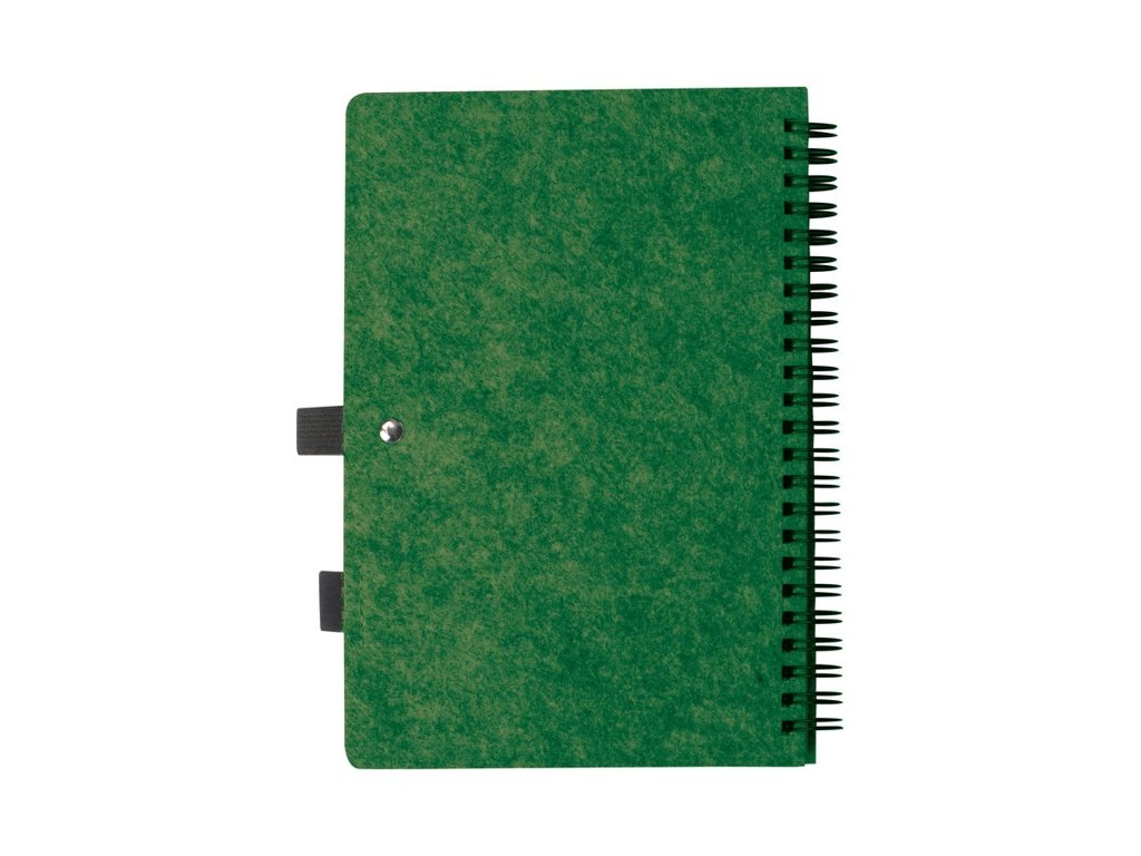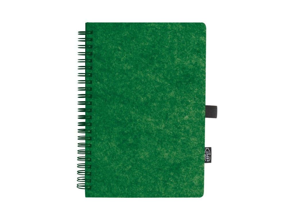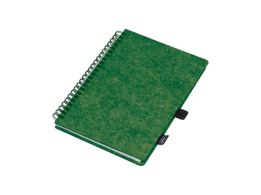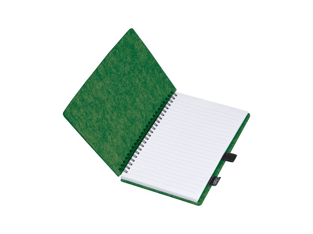 Plstený zápisník z RPET, obsahujúce 160 linajkových strán z recyklovaného papiera so špirálovou väzbou, pútkom na guľôčkové pero a označením RPET.