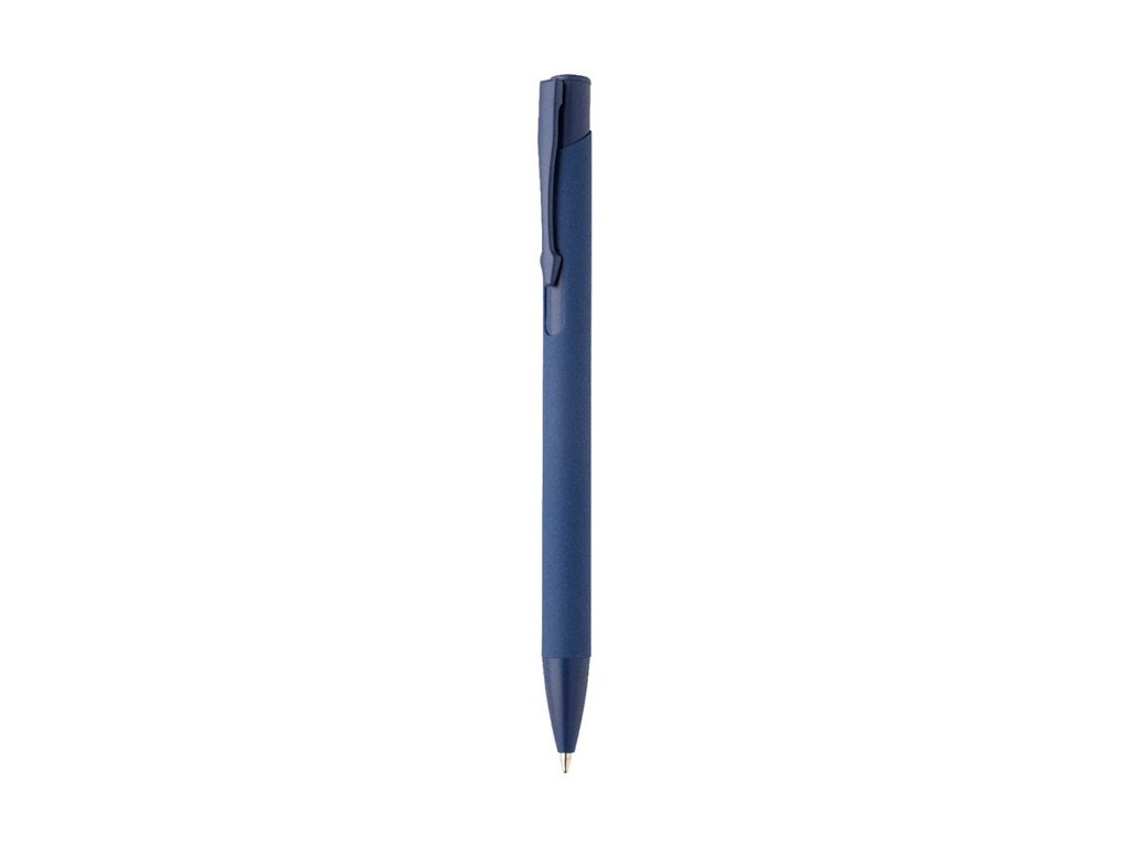 Guľôčkové pero z recyklovaného hliníka s pogumovaným telom a farebnými lesklými kovovými dielmi. So špeciálnym povrchom na zrkadlové gravírovanie, ktoré zodpovedá kovovým častiam. S modrou náplňou.