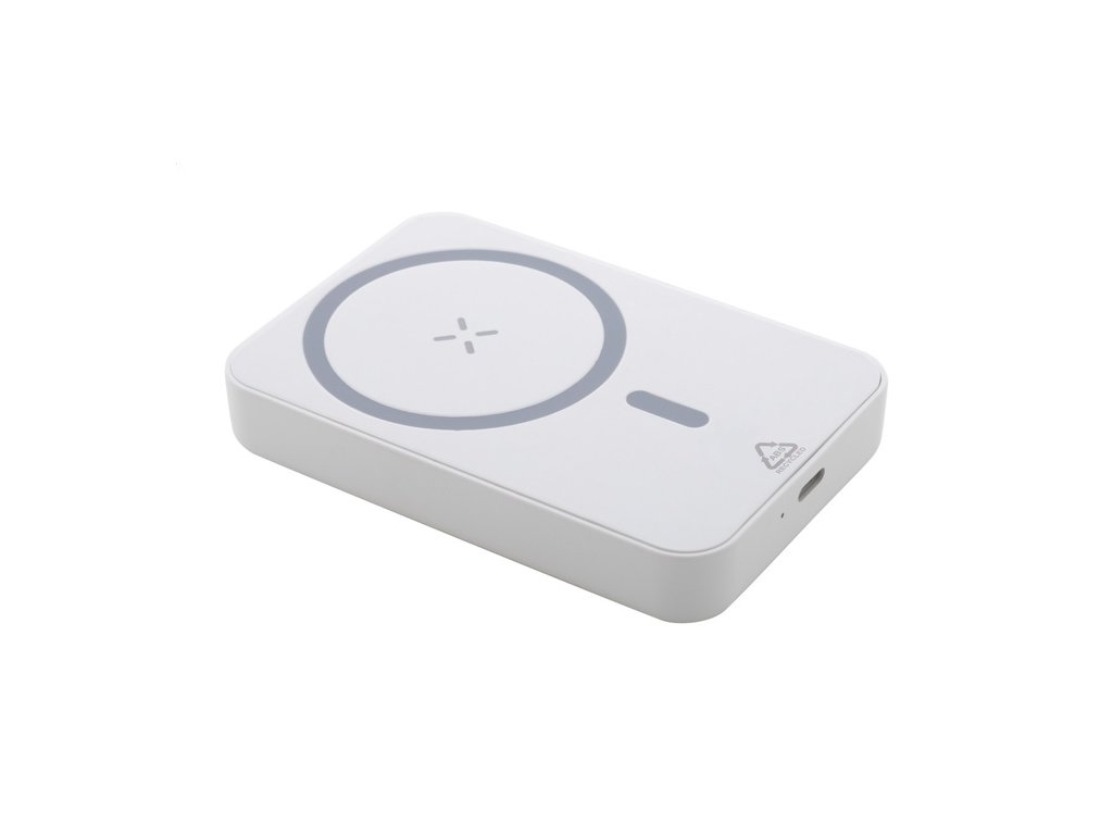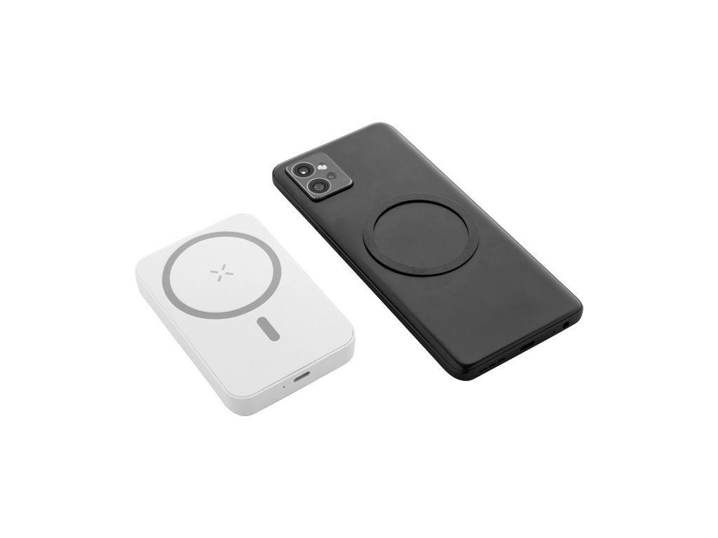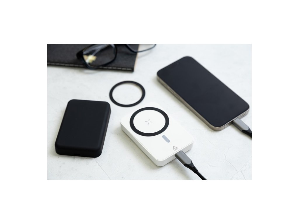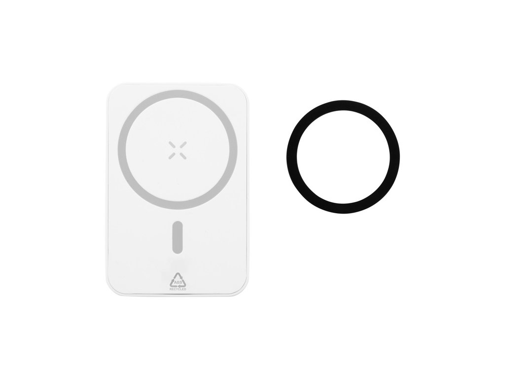 Powerbanka z recyklovaného ABS s 5000 mAh batériou a bezdrôtovou nabíjačkou 5W. So vstupom USB-C a portom pre nabíjačku. Vrátane samolepiaceho kovového krúžku. Kompatibilný s iPhone® 12 alebo novším. Vrátane USB nabíjacieho kábla.