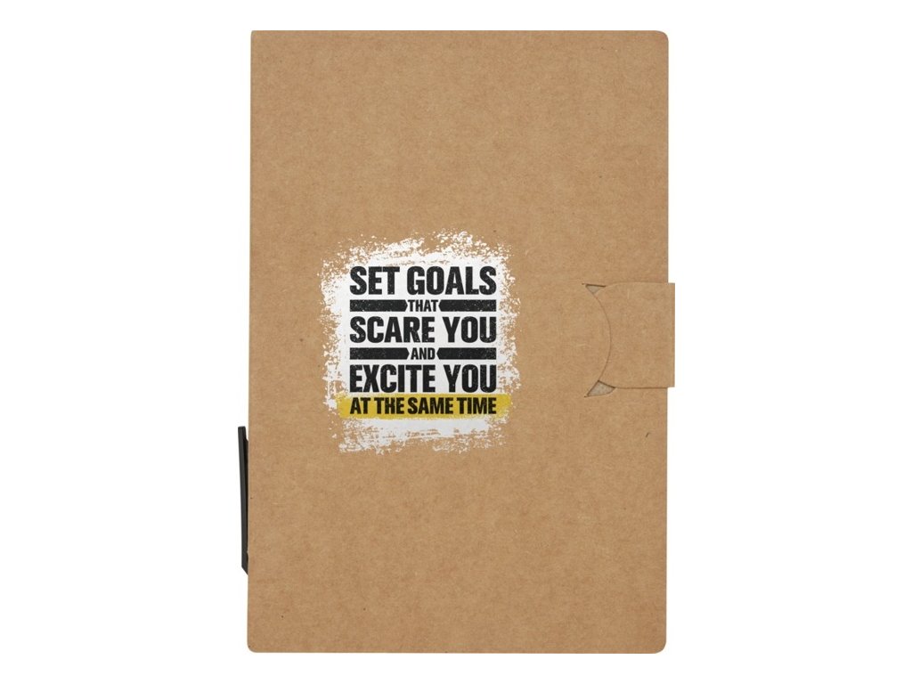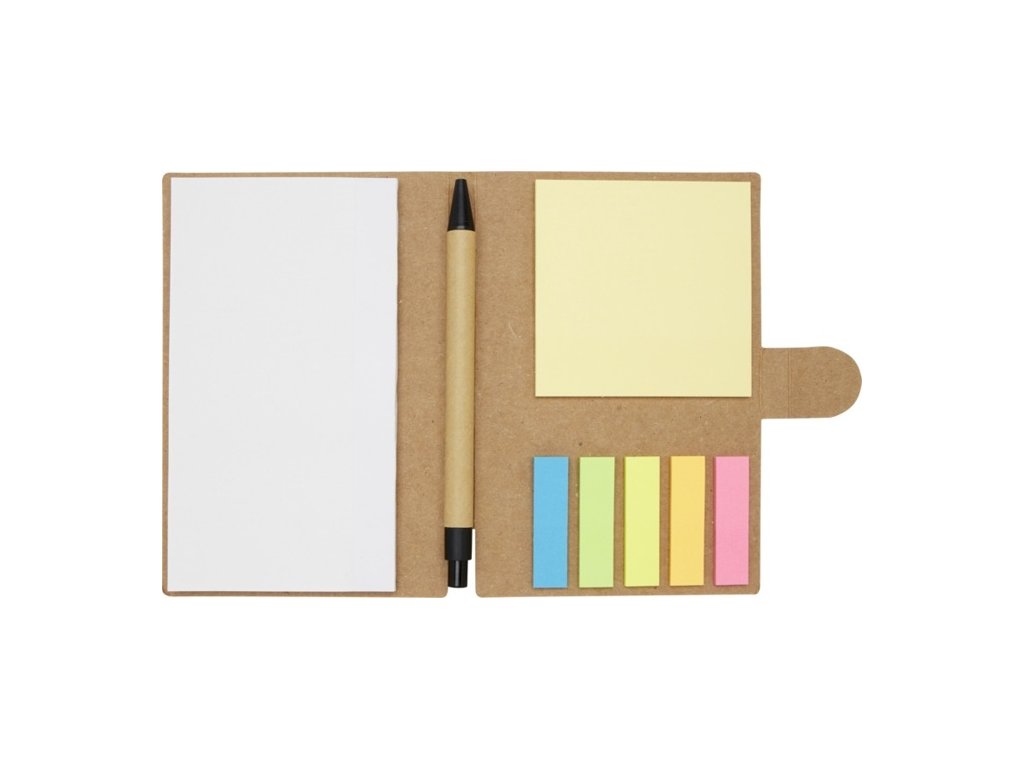Má 25 bielych listov nelinkovaného papiera 70 g/m2 (14,1 × 7,8 cm), malé (4,5 × 1,2 cm) a veľké (7,5 × 7,5 cm) farebné lepiace papieriky. Telo guľôčkového pera je vyrobené z recyklovaného papiera. Čierna náplň. Dĺžka písania: 500 metrov. Hrot: 1,00 mm.