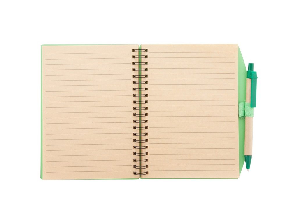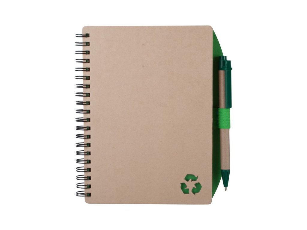 Krúžkový blok z recyklovaného papiera s 80 listami, vrátane guľôčkového pera s modrou náplňou.