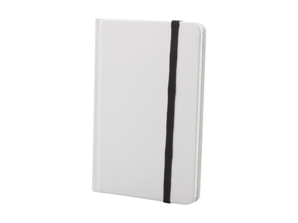 Poznámkový blok s bielymi doskami, 80 čistými listami a farebnou gumičkou.