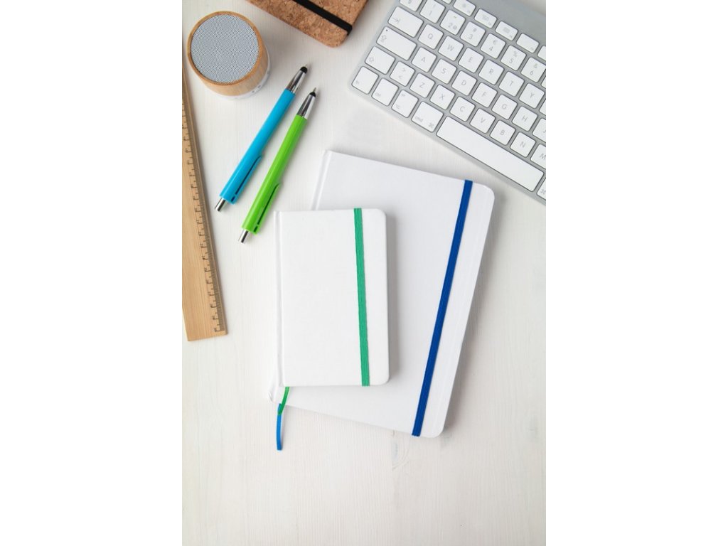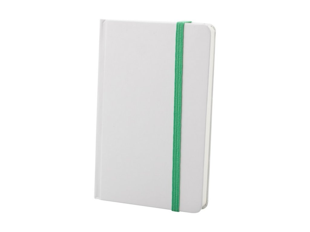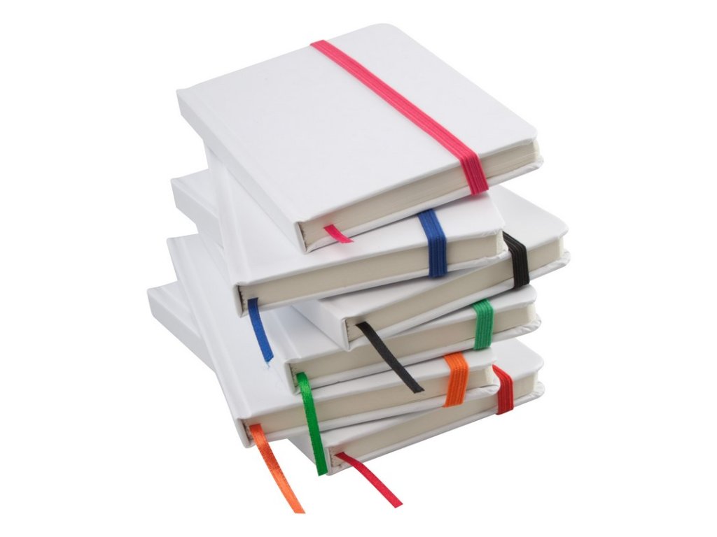 Poznámkový blok s bielymi doskami, 80 čistými listami a farebnou gumičkou.