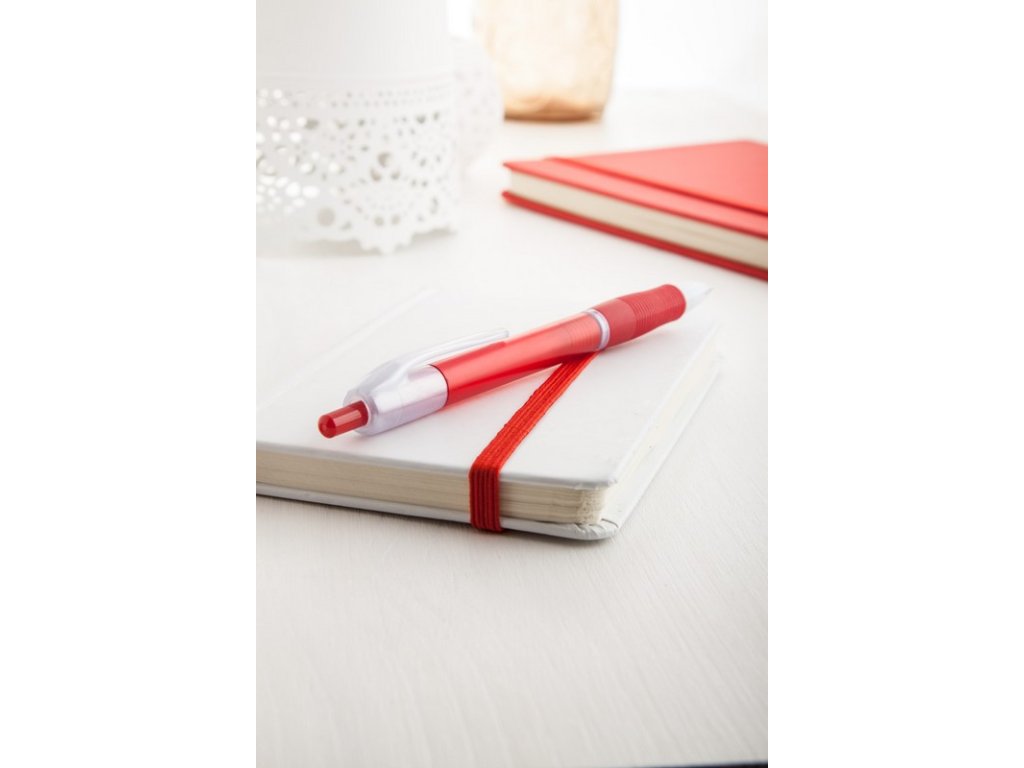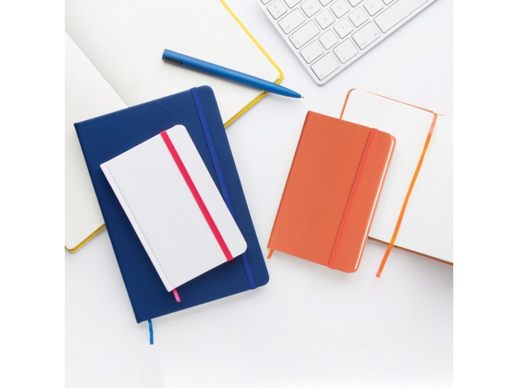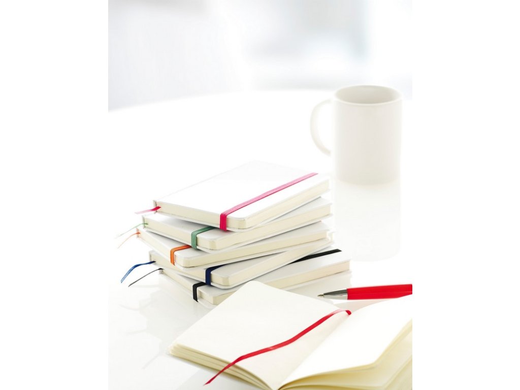 Poznámkový blok s bielymi doskami, 80 čistými listami a farebnou gumičkou.