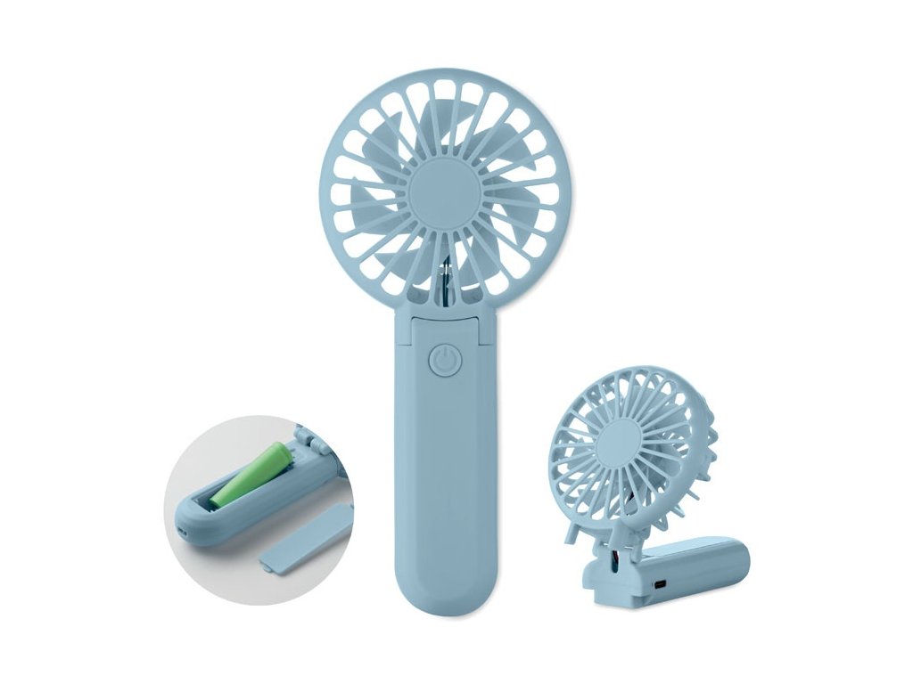 Prenosný skladací ventilátor z ABS plastu s 3 nastaveniami rýchlosti. Môže sa používať ako ručný alebo stolový ventilátor. Obsahuje 1 vymeniteľnú a nabíjateľnú lítiovú batériu 14500 s kapacitou 500 mAh.
