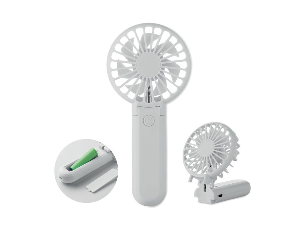 Prenosný skladací ventilátor z ABS plastu s 3 nastaveniami rýchlosti. Môže sa používať ako ručný alebo stolový ventilátor. Obsahuje 1 vymeniteľnú a nabíjateľnú lítiovú batériu 14500 s kapacitou 500 mAh.