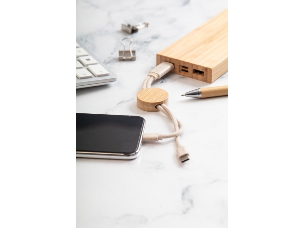 Prívesok na kľúče USB nabíjací kábel z ekologického plastu z pšeničnej slamy a bambusu. S konektormi micro USB, USB-C a Lightning. So vstupmi USB a USB-C.