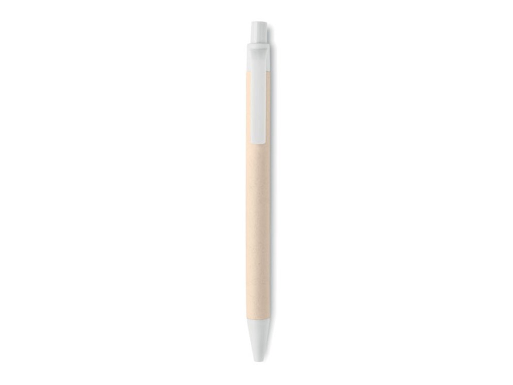 Tlačítkové kuličkové pero s tělem ze směsi recyklovaných kartonů od mléka (70%) a recyklovaného papíru (30%) a doplňky z PLA (100% biologicky rozložitelná kukuřice). Modrý inkoust.