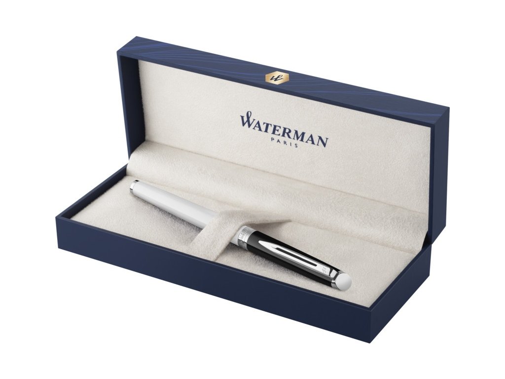 Roller Waterman Hemisphere s farebným telom a palladiovým pruhom. Jemná špička umožňuje hladké a presné písanie, zatiaľ čo ergonomický dizajn zaisťuje pohodlie pri dlhšom používaní. Dodáva sa v darčekovej krabičke. Čierna náplň. Dĺžka písania: 800 metrov.