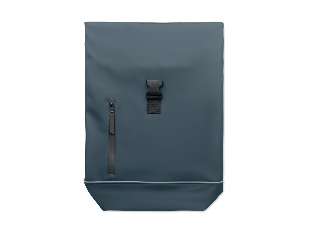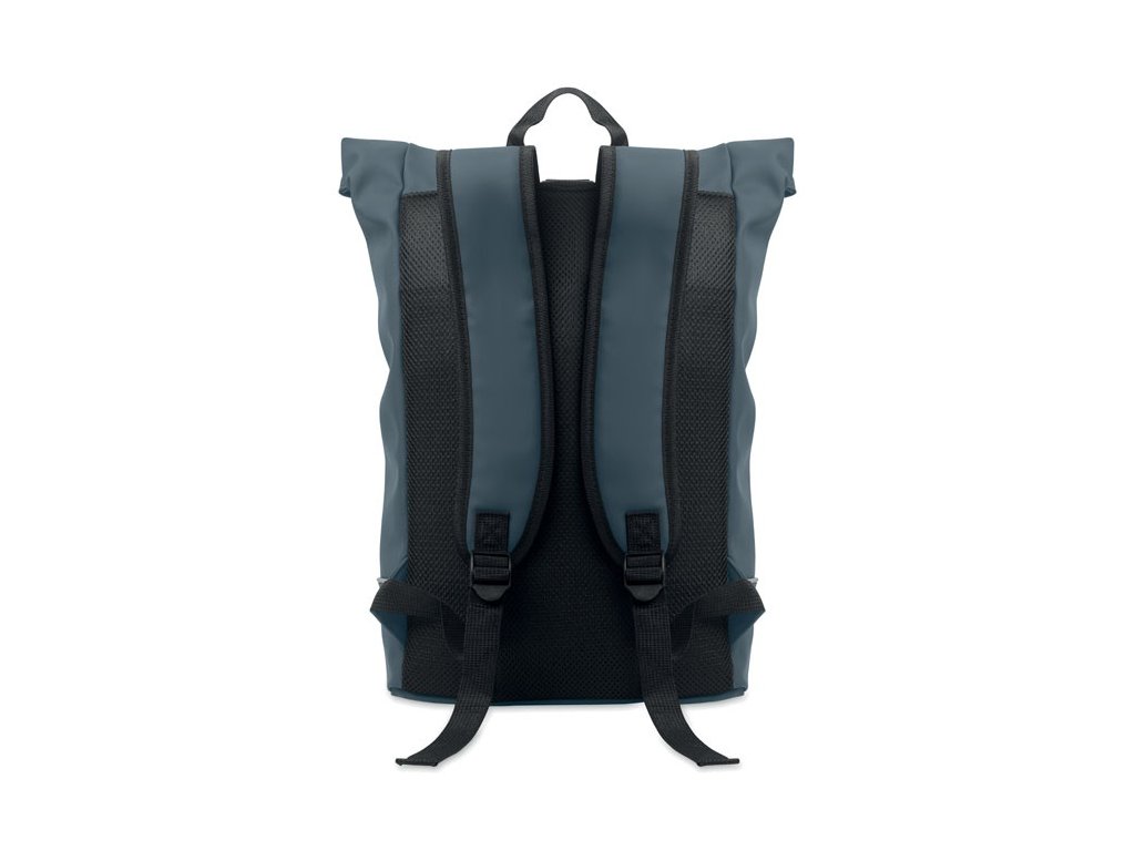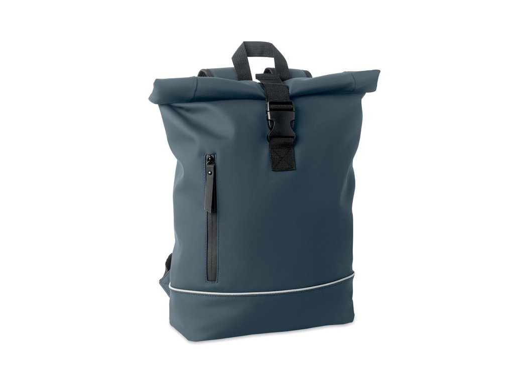 15-palcový batoh na notebook s rolovacím vrchom z mäkkého PU s polstrovaným chrbtom a výstužou dna s reflexným pásikom. Vodeodolné predné vrecko na zips. Podšívka z 210D RPET polyesteru.
