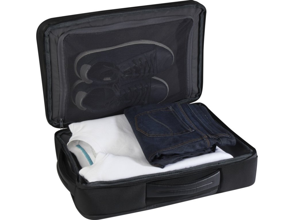 Vodoodpudivý materiál, priehradka na 17" notebook a tablet, rozšíriteľný oddiel na oblečenie, nepriepustné vrecko na toaletné potreby a predná priehradka. Polstrované a nastaviteľné popruhy, vrecko na kartu, pútko na okuliare a polstrovaná rukoväť.