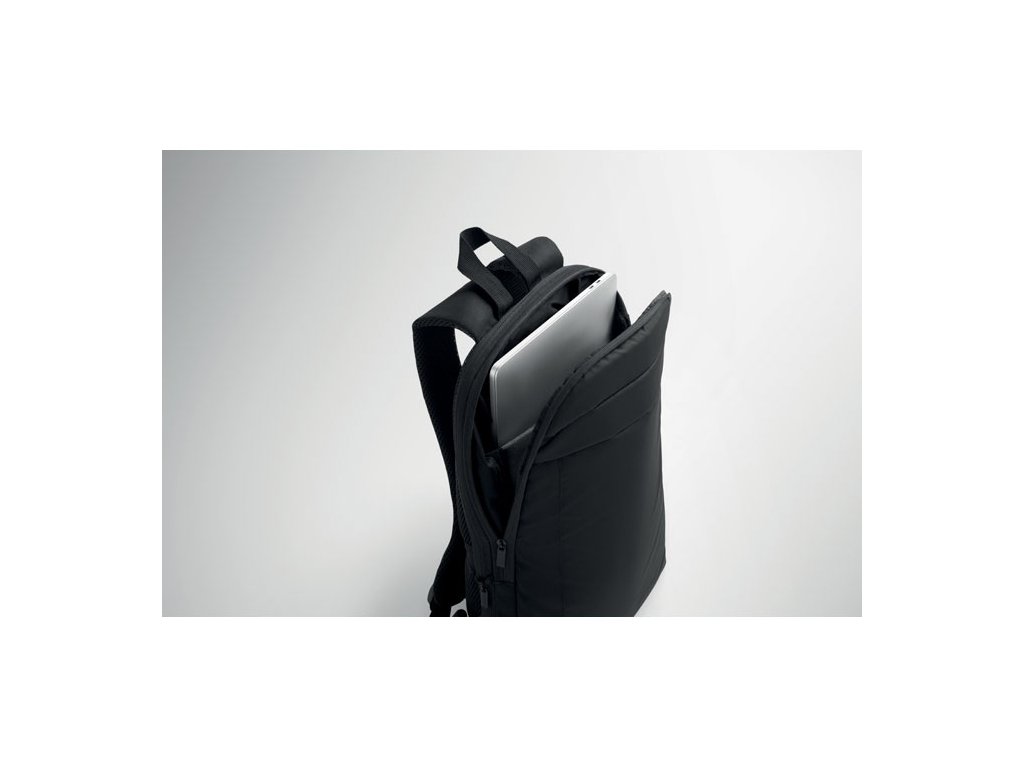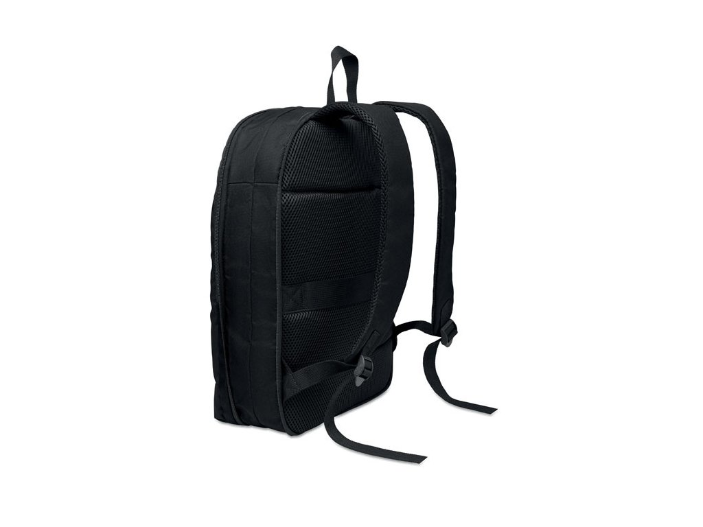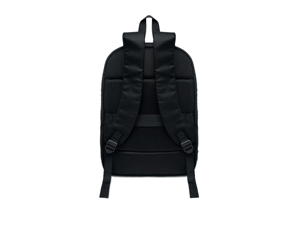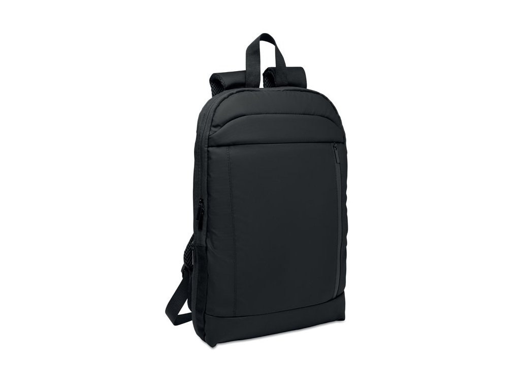 Rozšíriteľný 16-palcový počítačový batoh z 600D RPET polyesteru s PU záterom na prednej strane a podšívkou z RPET polyesteru. Skryté vrecko na zips a polstrovaná priehradka na notebook, predná priehradka, sieťovaný chrbát a popruh na kufor.