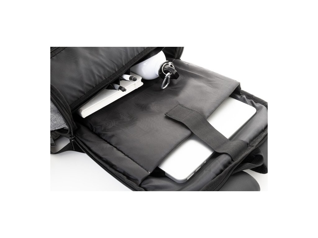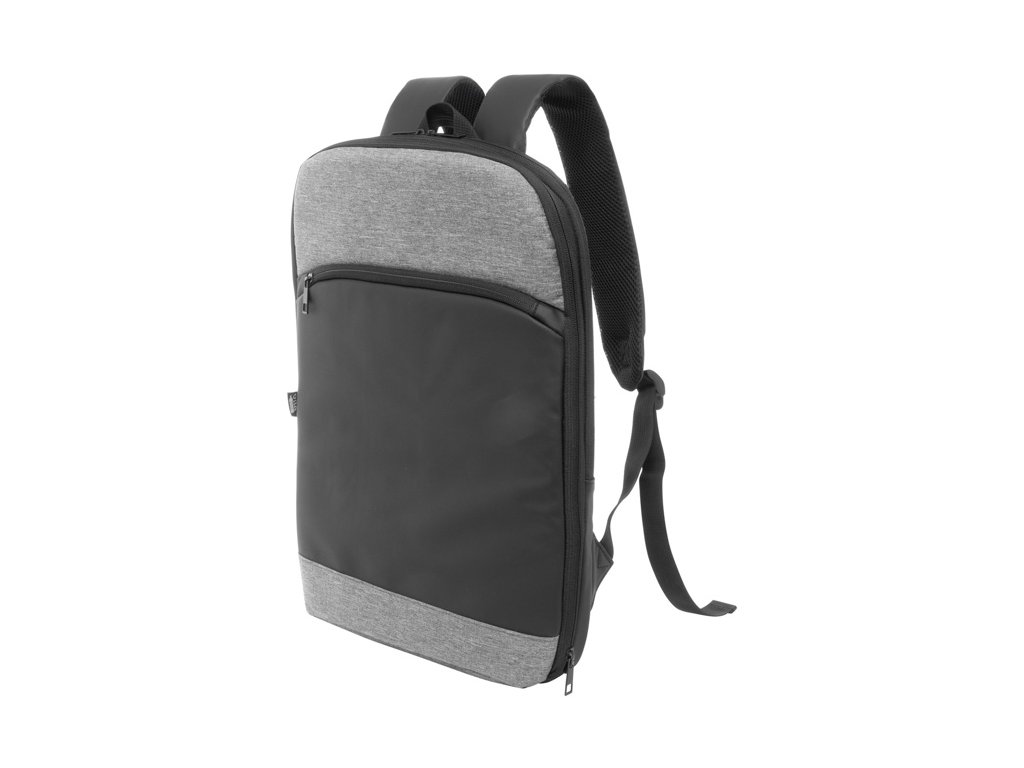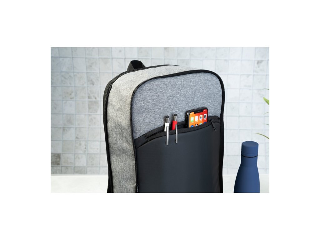 RPET rozšíriteľný batoh s hlavnou priehradkou na zips, predným vreckom na zips, polstrovanou priehradkou na notebook (15") a prednou stranou potiahnutou PU. S popruhom na vozík, polstrovaným chrbtom a ramennými popruhmi. S výrazným štítkom RPET