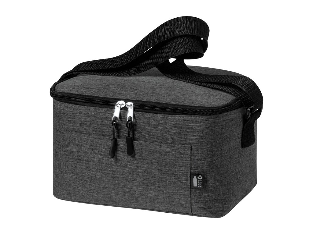 Chladiaca taška na zips s hliníkovou výstielkou, zmestí sa do nej 6 ks 0,33 l plechoviek. S predným vreckom a nastaviteľným ramenným popruhom. 600D RPET polyester s výrazným štítkom RPET.