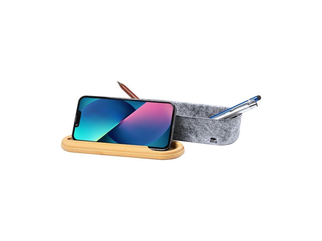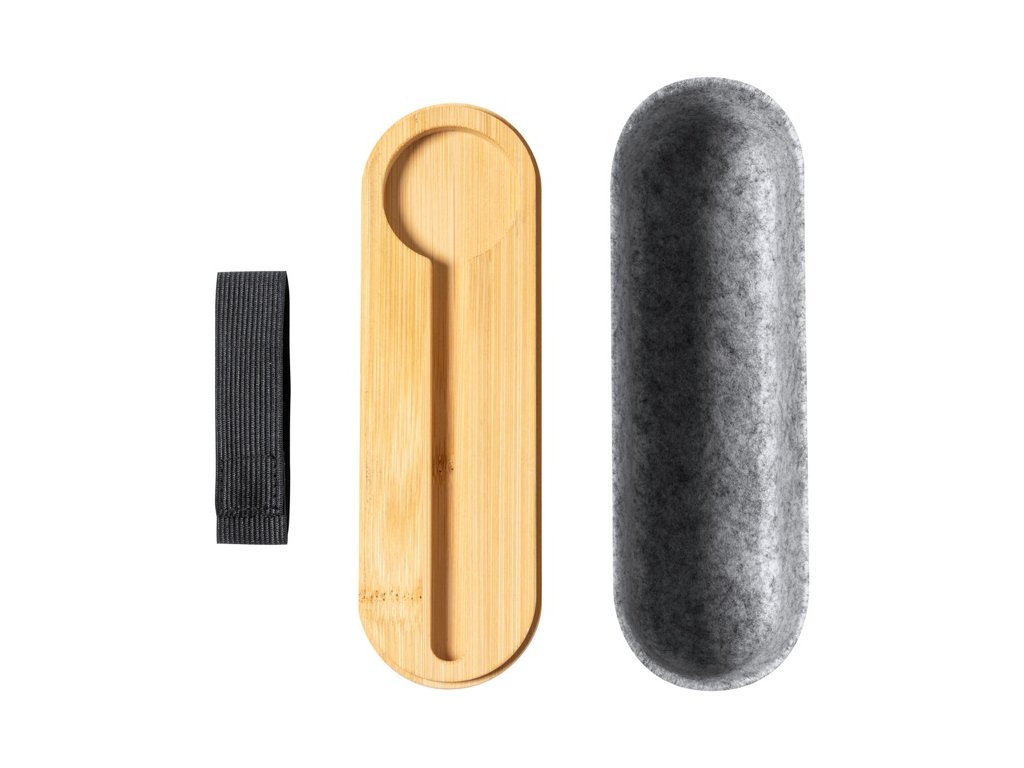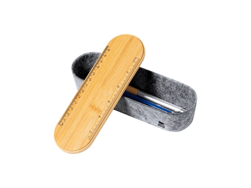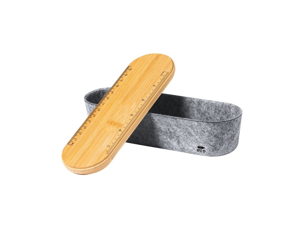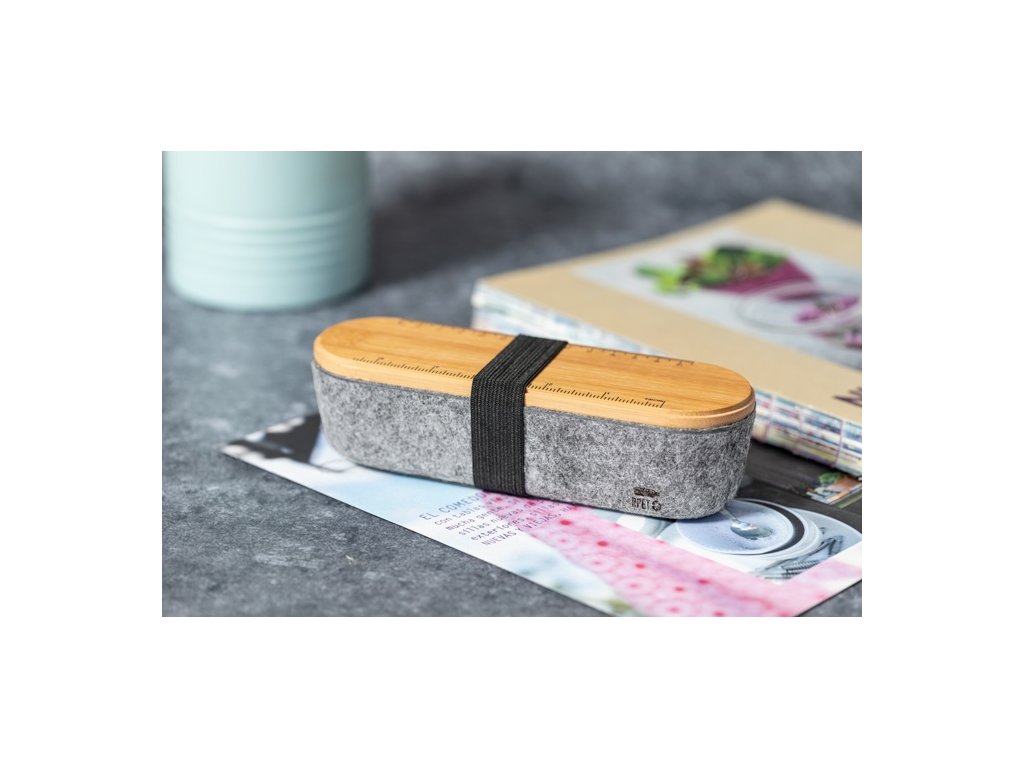 RPET puzdro na perá s bambusovým multifunkčným viečkom a gumičkou. Viečko poslúži ako pravítko aj ako držiak na mobil.