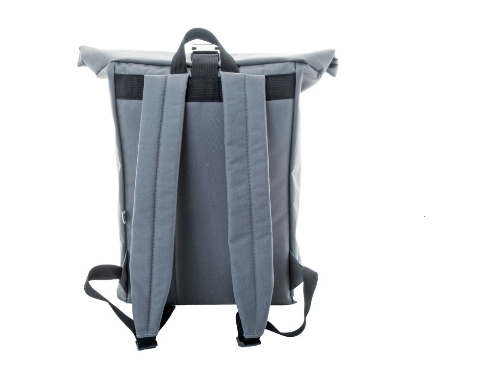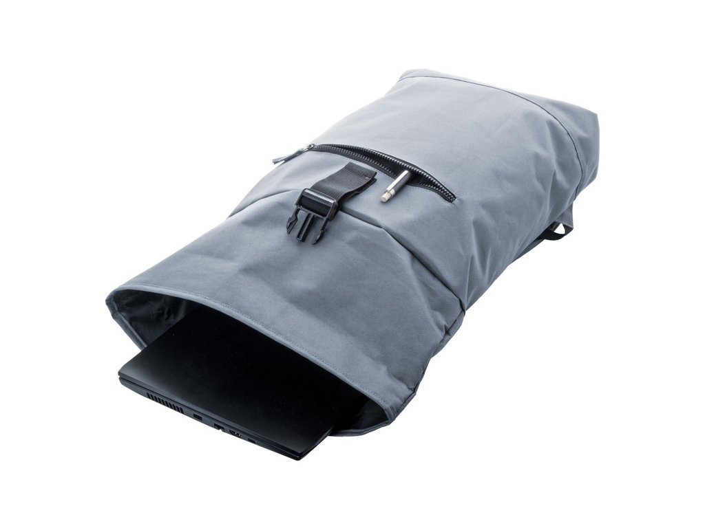 Rolovací batoh RPET so zapínaním na pracku, predné vrecko na zips, polstrovaná priehradka na notebook (15"), polstrovaný chrbát a ramenné popruhy. Polyester 600D RPET s výrazným štítkom RPET.