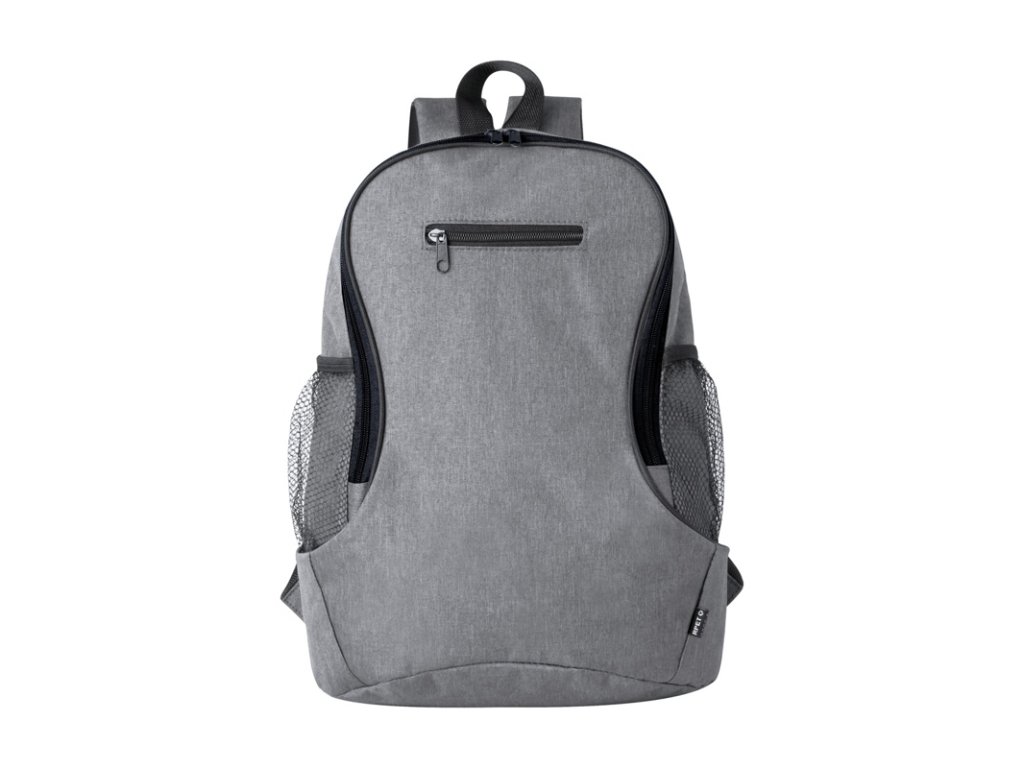 Batoh RPET s priehradkou na zips a predným vreckom, bočné sieťované vrecká, polstrovaný chrbát a ramenné popruhy. 300D RPET polyester s výrazným štítkom RPET.